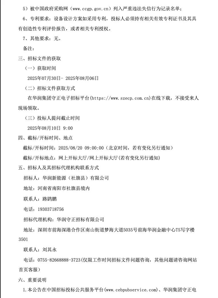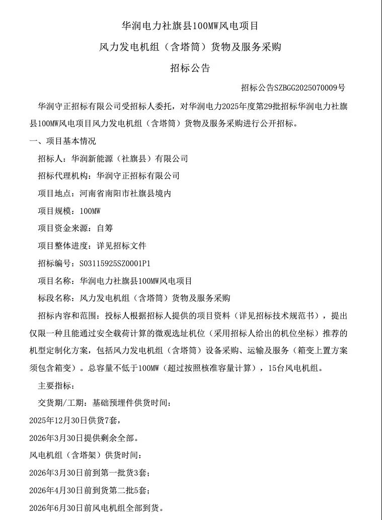招标文件显示:华润电力社旗县100MW风电项目,项目地点位于河南南阳,招标单位是华润新能源(社旗县)有限公司。