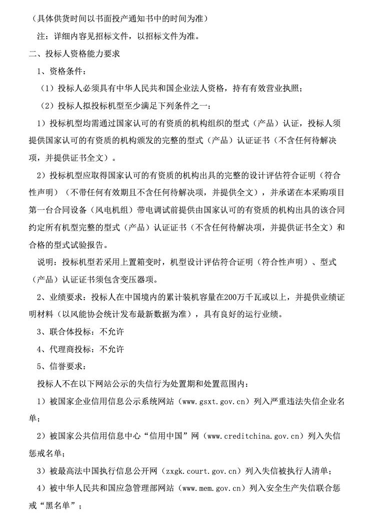 招标内容:仅限一种且能通过安全载荷计算的微观选址机位(采用招标人给出的机位坐标)推荐的机型定制化方案,包括风力发电机组(含塔筒)设备采购、运输及服务(箱变上置方案须包含箱变)。总容量不低于100MW(超过按照核准容量计算),15台风电机组。