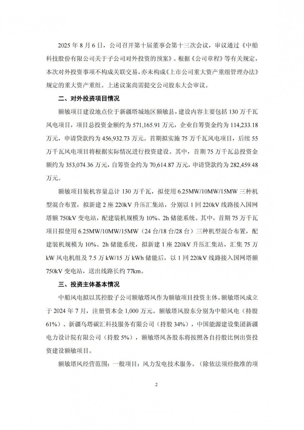 公告显示,中船科技全资子公司中国船舶集团风电发展有限公司(简称“中船风电”)拟以其控股子公司额敏塔风新能源有限公司(简称“额敏塔风”)在新疆塔城地区额敏县投资建设130万千瓦风电项目,项目总投资金额约为571,165.91万元。