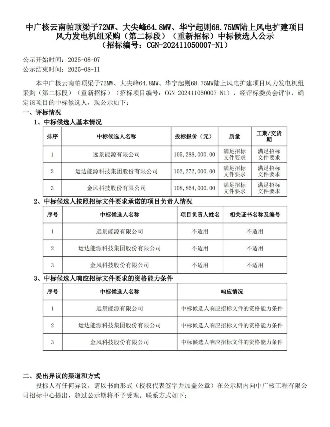 根据公示,远景能源作为第一中标候选人预中标。