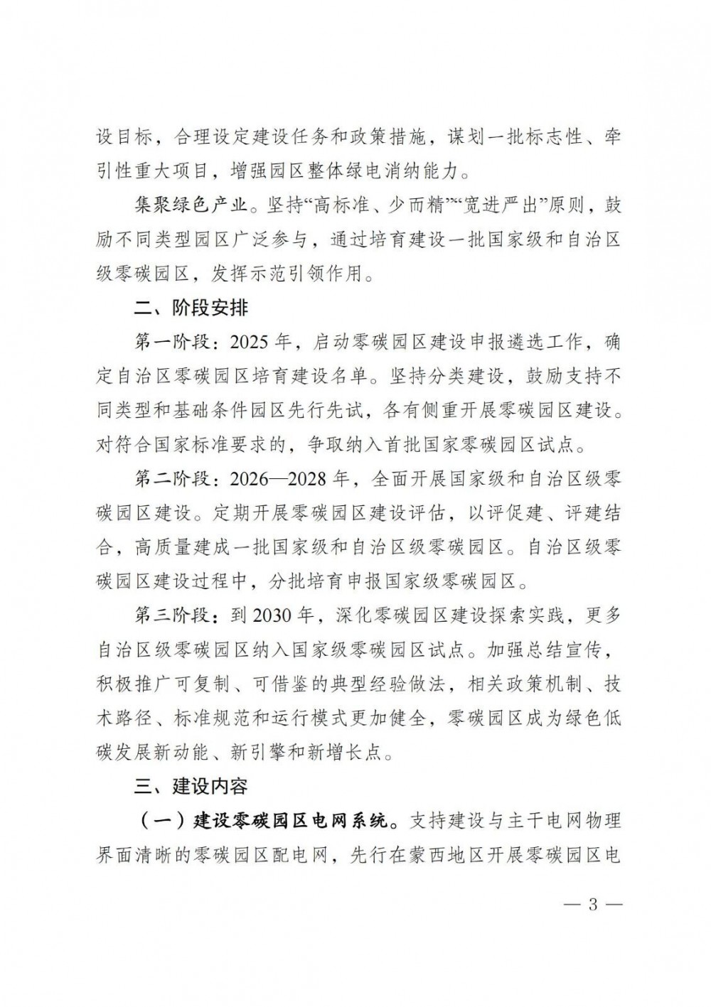 第一阶段:2025 年,启动零碳园区建设申报遴选工作,确定自治区零碳园区培育建设名单。坚持分类建设,鼓励支持不同类型和基础条件园区先行先试,各有侧重开展零碳园区建设。对符合国家标准要求的,争取纳入首批国家零碳园区试点。