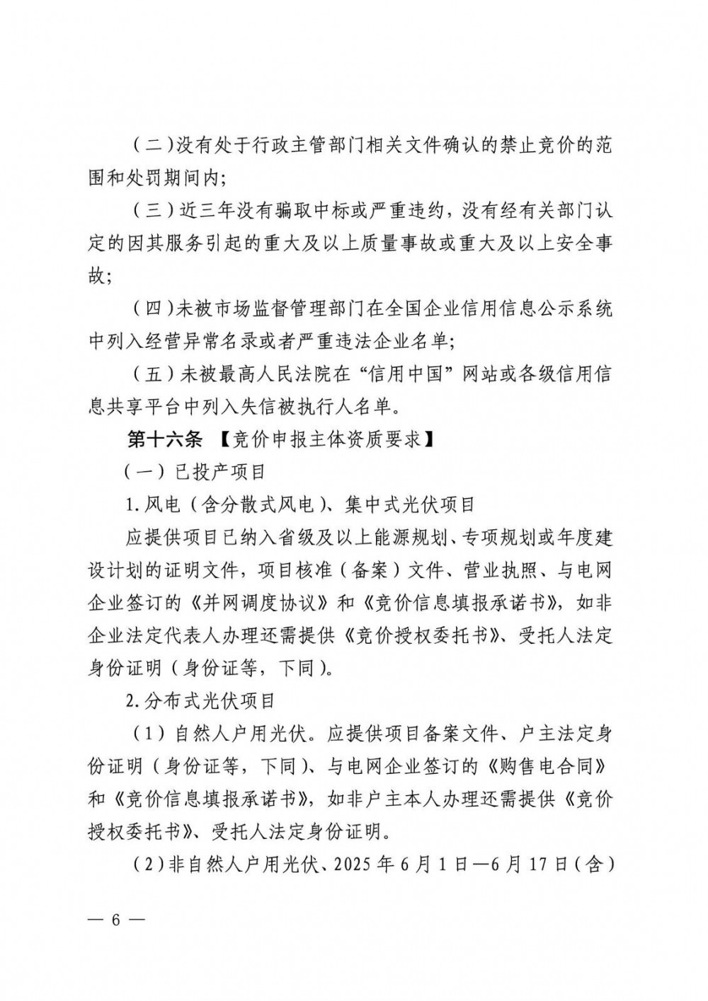公告指出,竞价申报主体为2025年6月1日-12月31日(含)投产(全容量并网,下同)的风电、集中式光伏、自然人户用光伏、非自然人户用光伏项目,2025年6月1日-6月17日(含)投产的一般工商业分布式光伏项目。