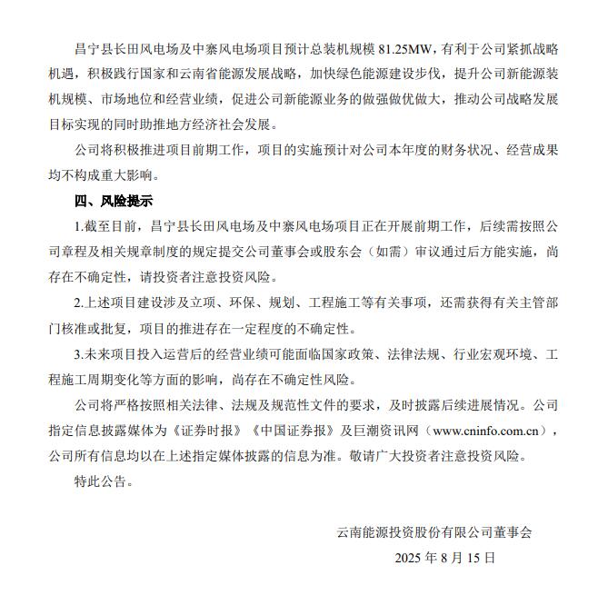 8月15日,云南能投发布关于拟投资建设昌宁县长田风电场及中寨风电场项目的提示性公告。
