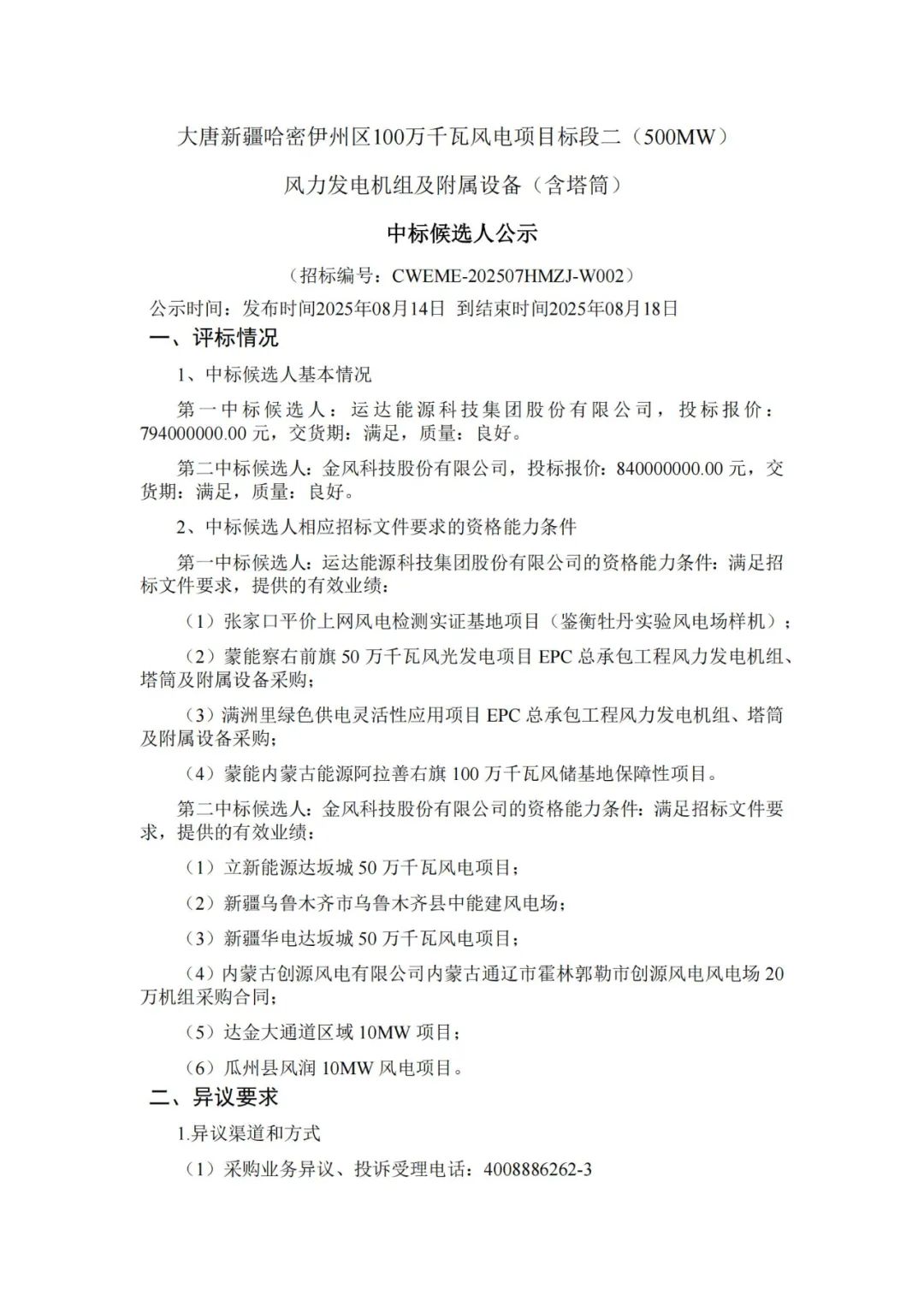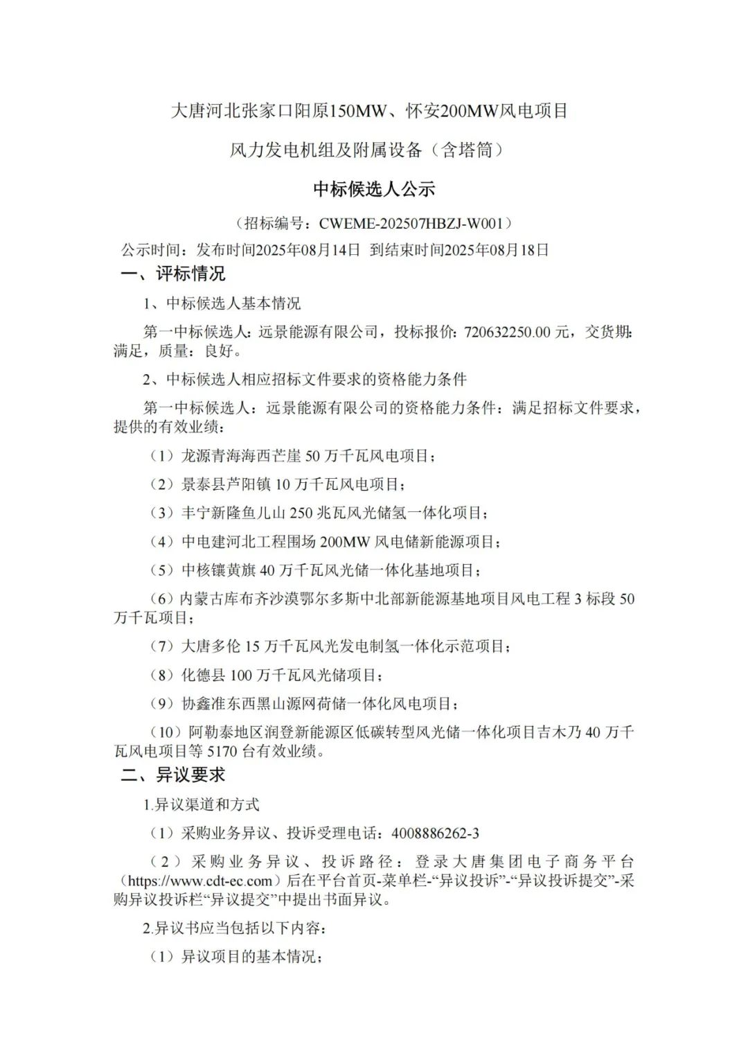 根据公示,远景能源、运达股份、电气风电作为第一中标候选人预中标。
