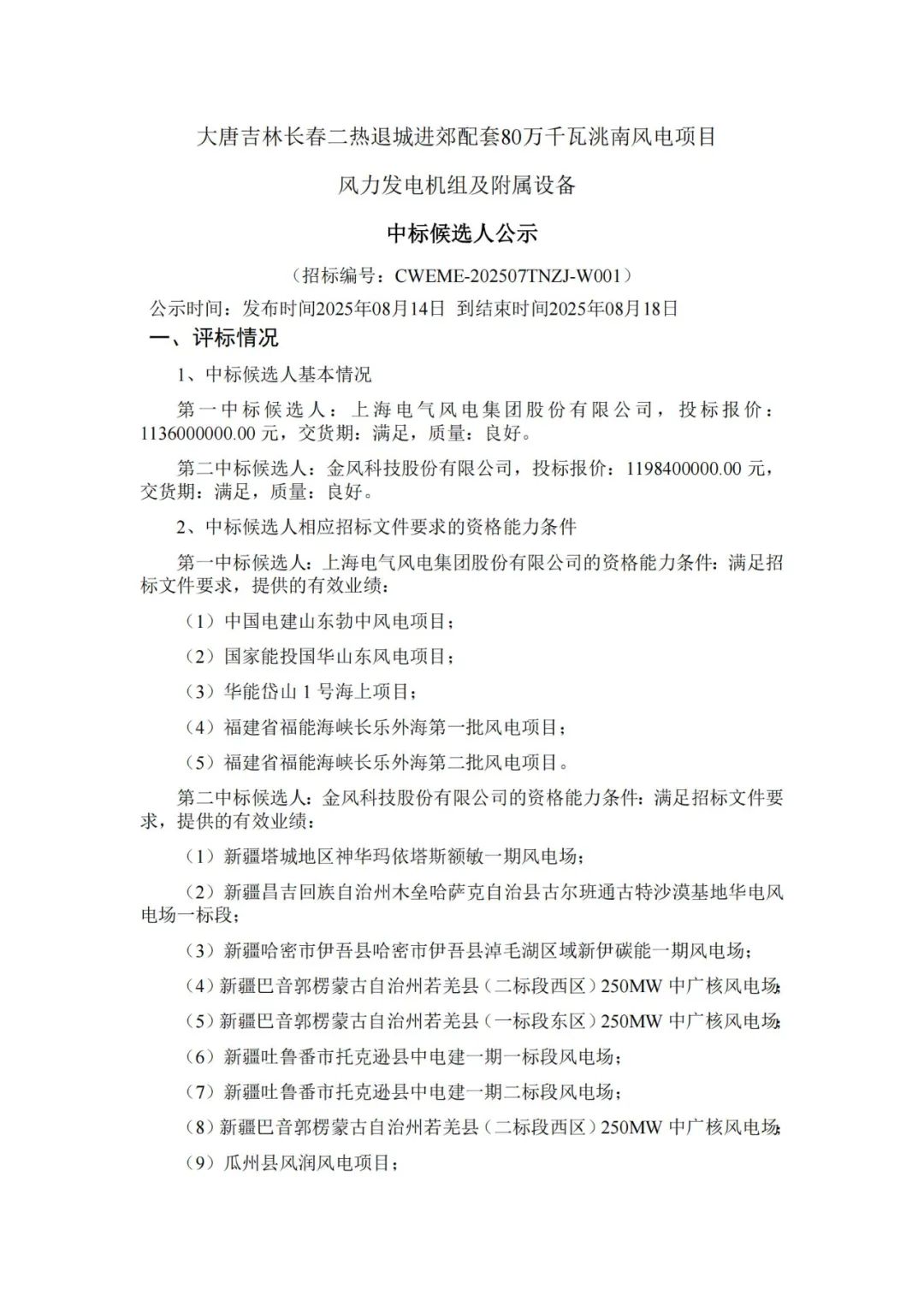大唐吉林长春二热退城进郊配套80万千瓦洮南风电项目位于吉林省长春市,项目分为两个场区,每个场区400MW,总容量800MW,各场区容量、总容量不允许上下浮动,8.0MW≤单机容量≤8.5WM,允许不超过8台机组降容运行;不接受混排;可用机位点96个;叶轮直径≥230m,叶片必须采用碳纤维技术,轮毂高度166m;塔筒型式:钢混塔。交货日期:计划2027年3月1日前风电机组首套交货,2027年8月1日之前全部交货完毕,具体交货日期以最终用户要求为准。