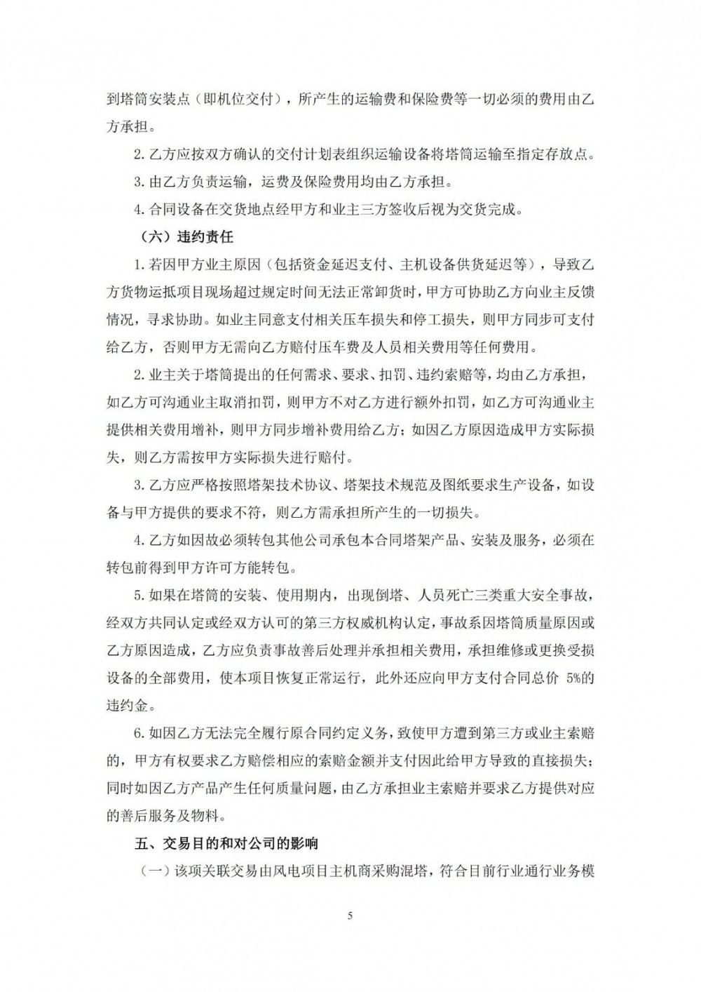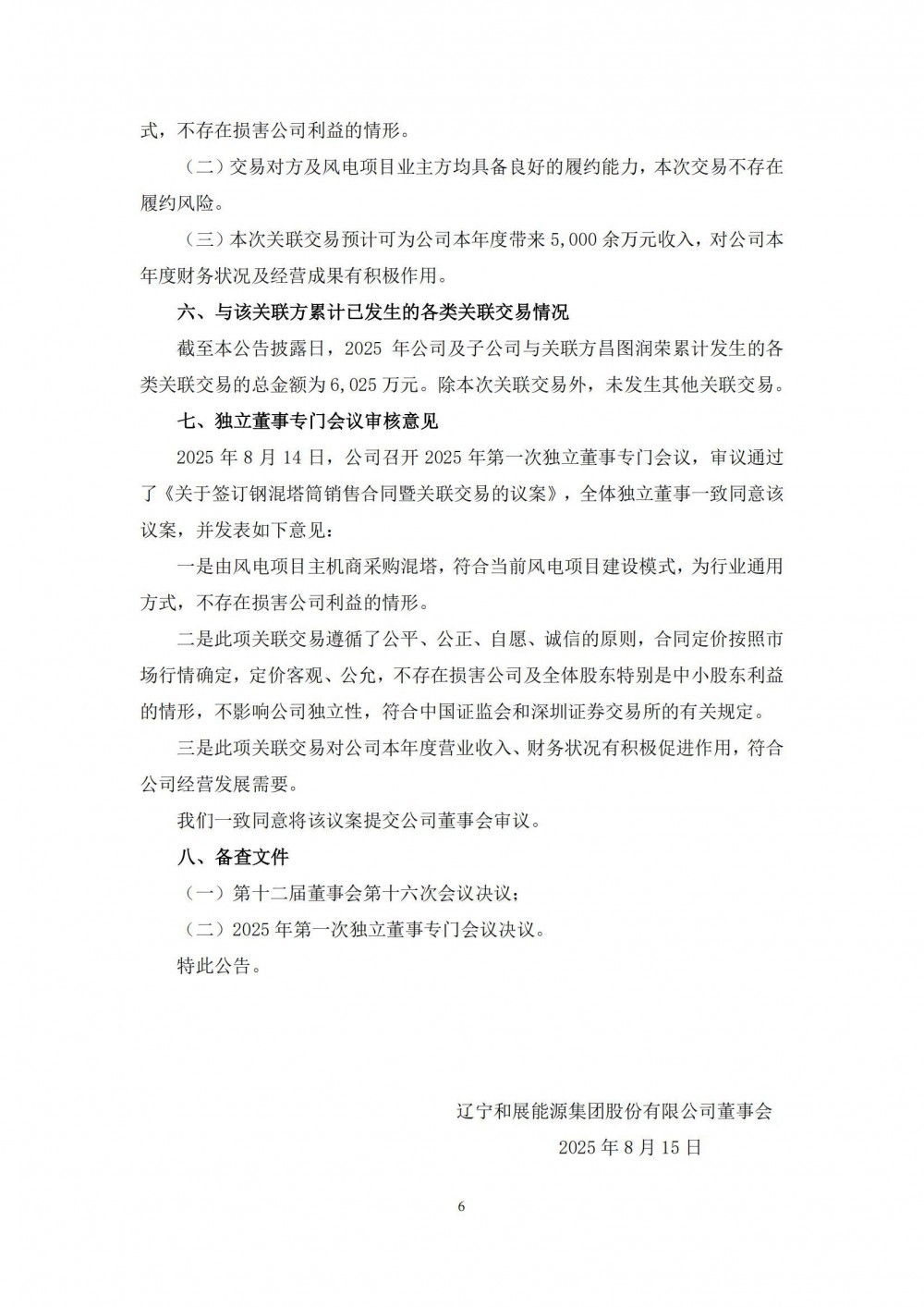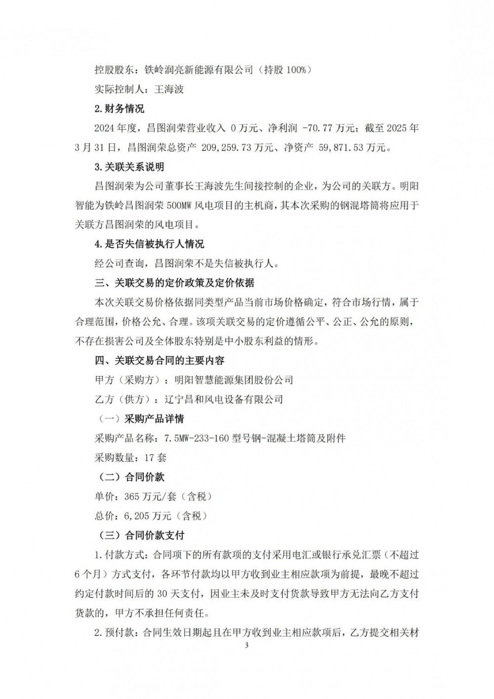 公告显示,2025年8月15日,辽宁和展能源集团股份有限公司召开第十二届董事会第十六次会议,审议通过了《关于签订钢混塔筒销售合同暨关联交易的议案》,同意公司二级全资子公司辽宁昌和风电设备有限公司(简称“昌和风电”)作为供方与采购方明阳智慧能源集团股份公司(简称“明阳智能”)签订《铁岭昌图润荣500MW项目17套钢-混凝土塔筒及附件采购合同》。