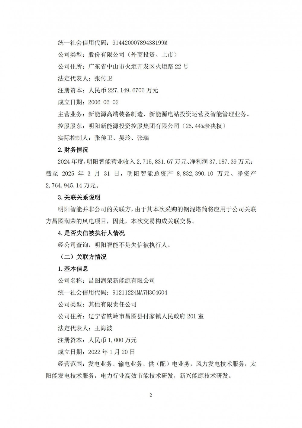 本次明阳智能采购的钢混塔筒将应用于昌图润荣新能源有限公司(以下简称“昌图润荣”)的 500MW风电项目,昌图润荣为公司董事长王海波先生间接控制的企业,为公司的关联方,本次交易构成关联交易。