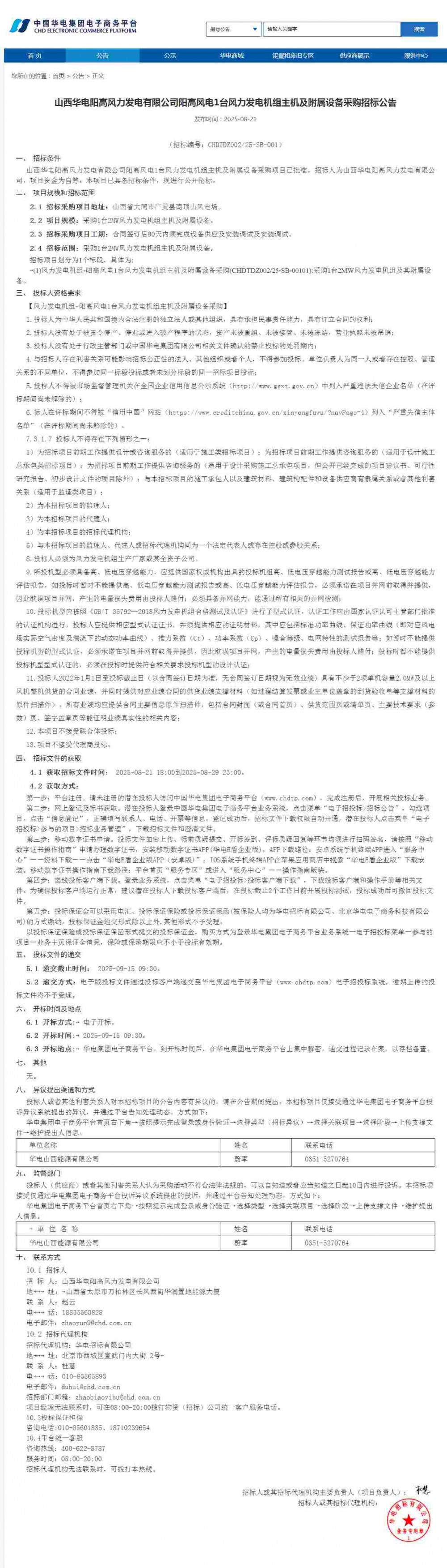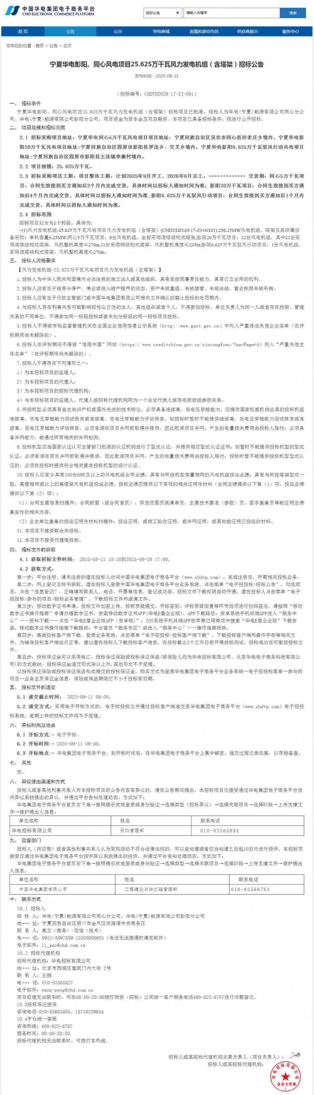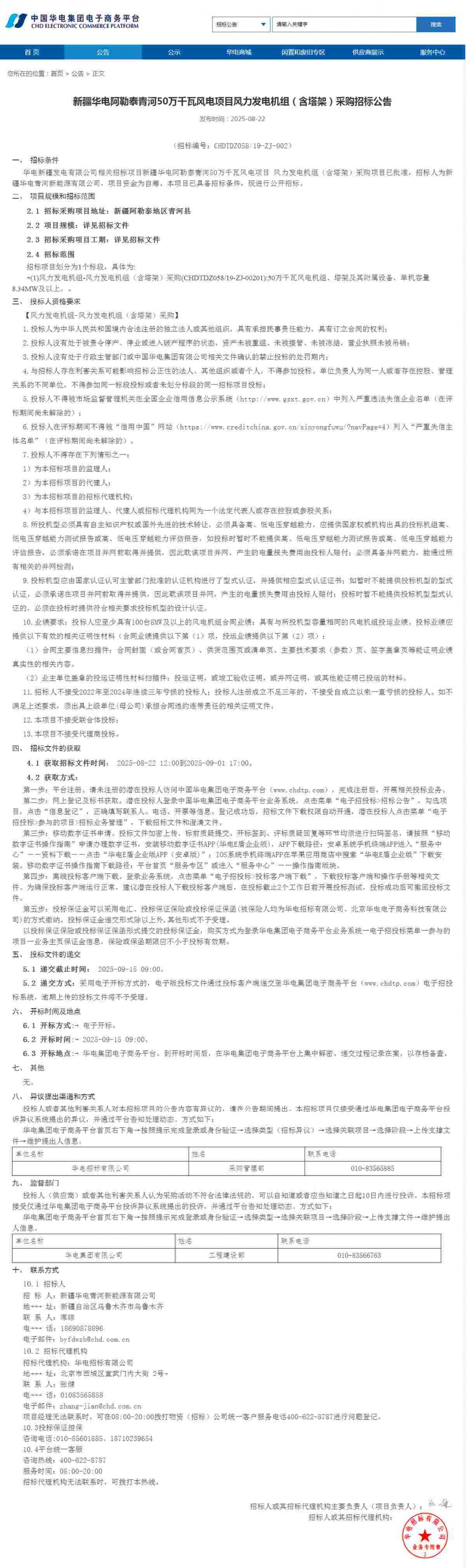 8月21日、22日,中国华电集团电子商务平台发布8个风电项目风电机组采购招标公告,规模合计1183.25MW。