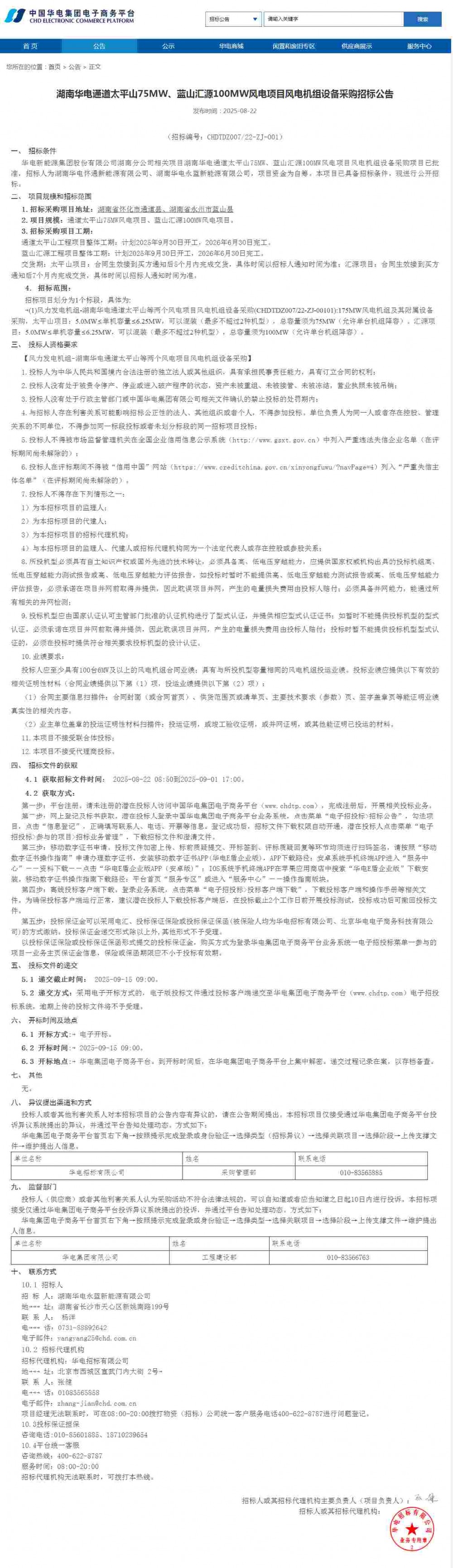 湖南华电蓝山汇源100MW风电项目位于湖南省永州市蓝山县,5.0MW≤单机容量≤6.25MW,可以混装(最多不超过2种机型),总容量须为100MW(允许单台机组降容)。计划2025年9月30日开工,2026年6月30日完工。交货期:合同生效接到买方通知后7个月内完成交货,具体时间以招标人通知时间为准。
