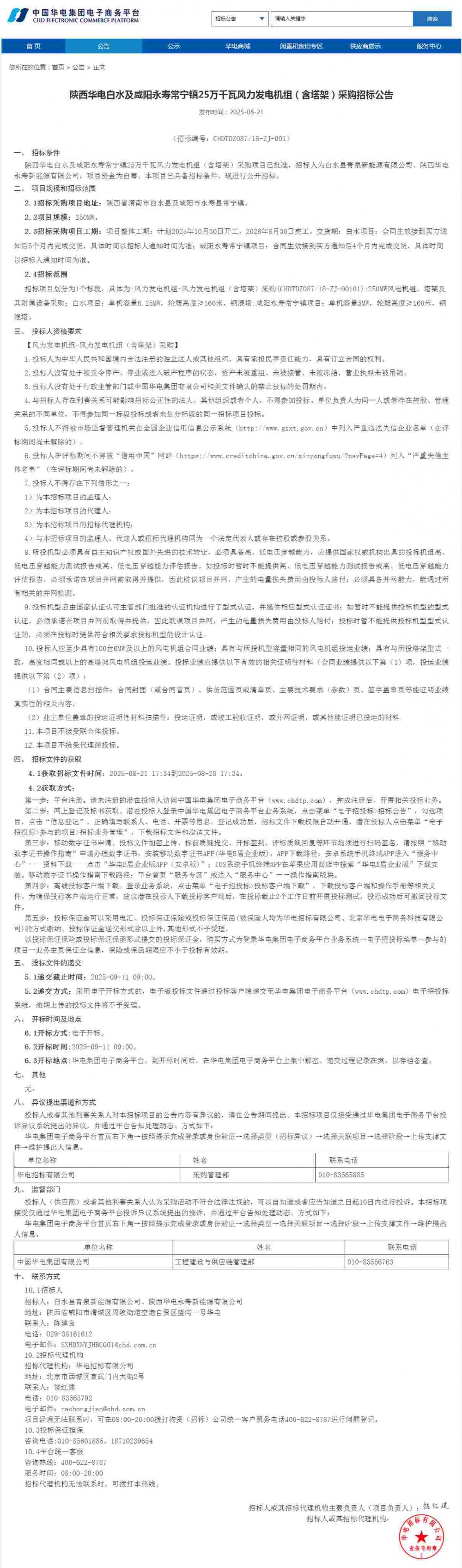 陕西华电白水及咸阳永寿常宁镇25万千瓦风电项目位于陕西省渭南市白水县及咸阳市永寿县常宁镇,项目规模250MW,白水项目:单机容量6.25MW,轮毂高度≥160米,钢混塔;咸阳永寿常宁镇项目:单机容量5MW,轮毂高度≥160米,钢混塔。计划2025年10月30日开工,2026年6月30日完工。交货期:白水项目:合同生效接到买方通知后5个月内完成交货,具体时间以招标人通知时间为准;咸阳永寿常宁镇项目:合同生效接到买方通知后4个月内完成交货,具体时间以招标人通知时间为准。