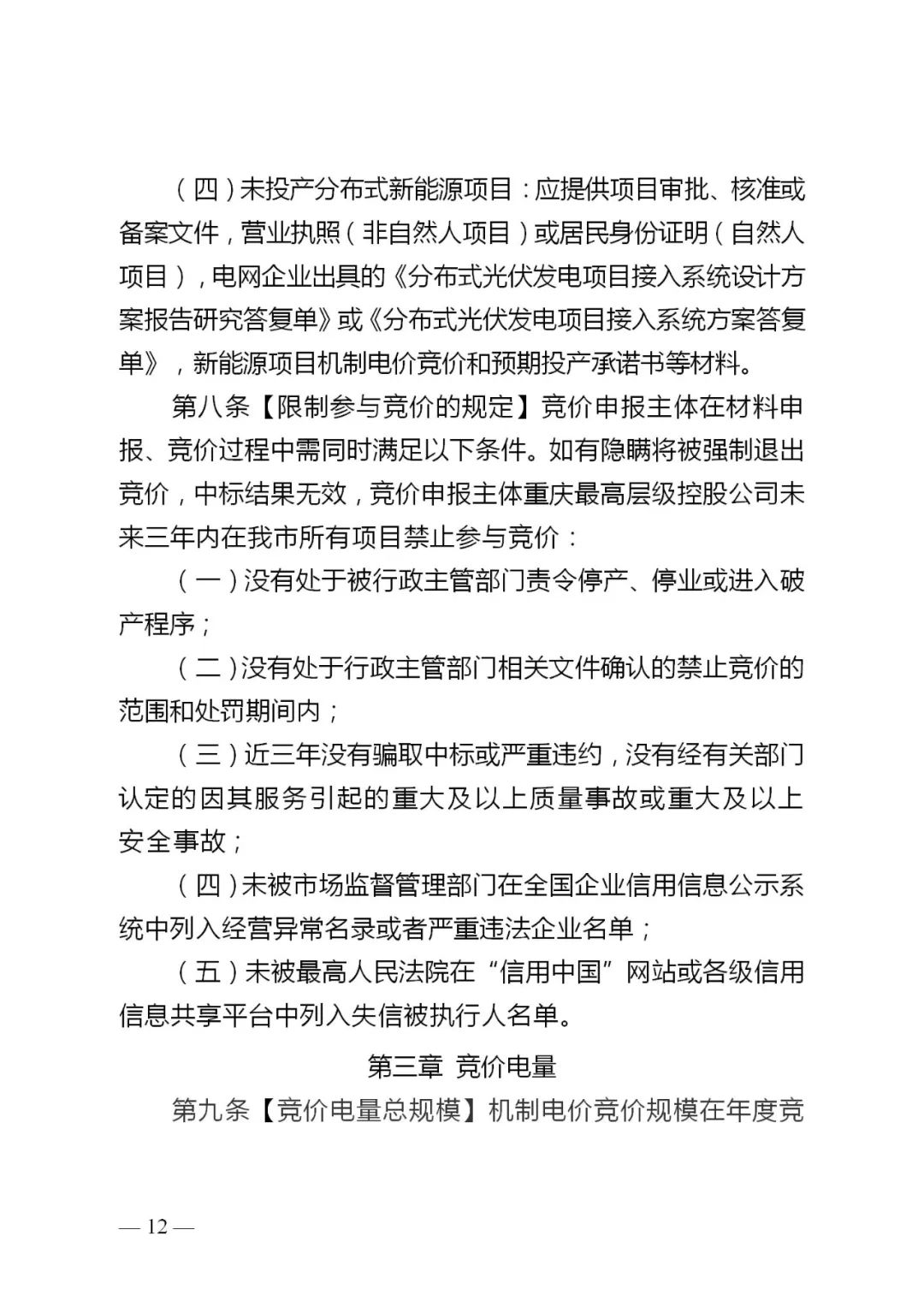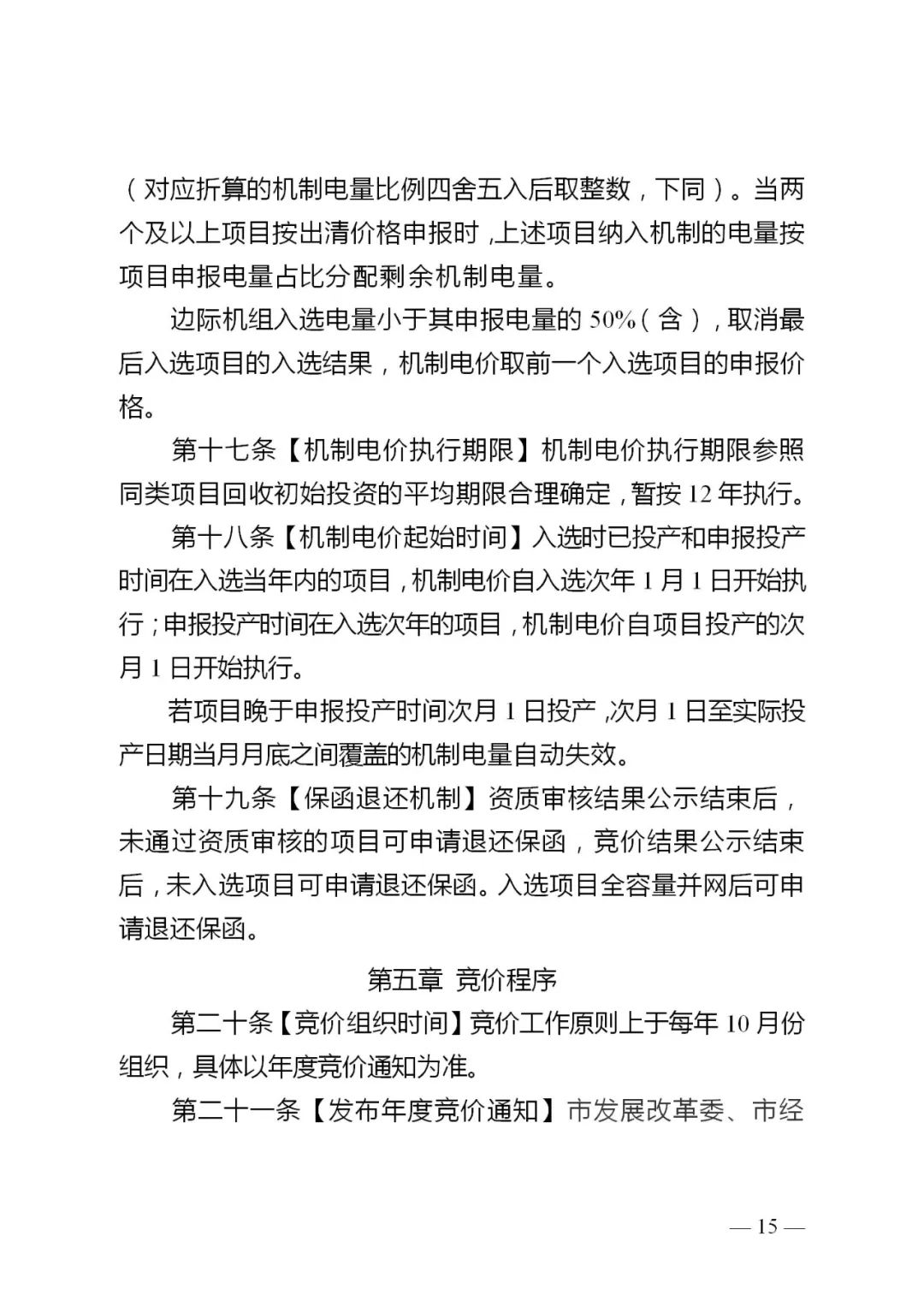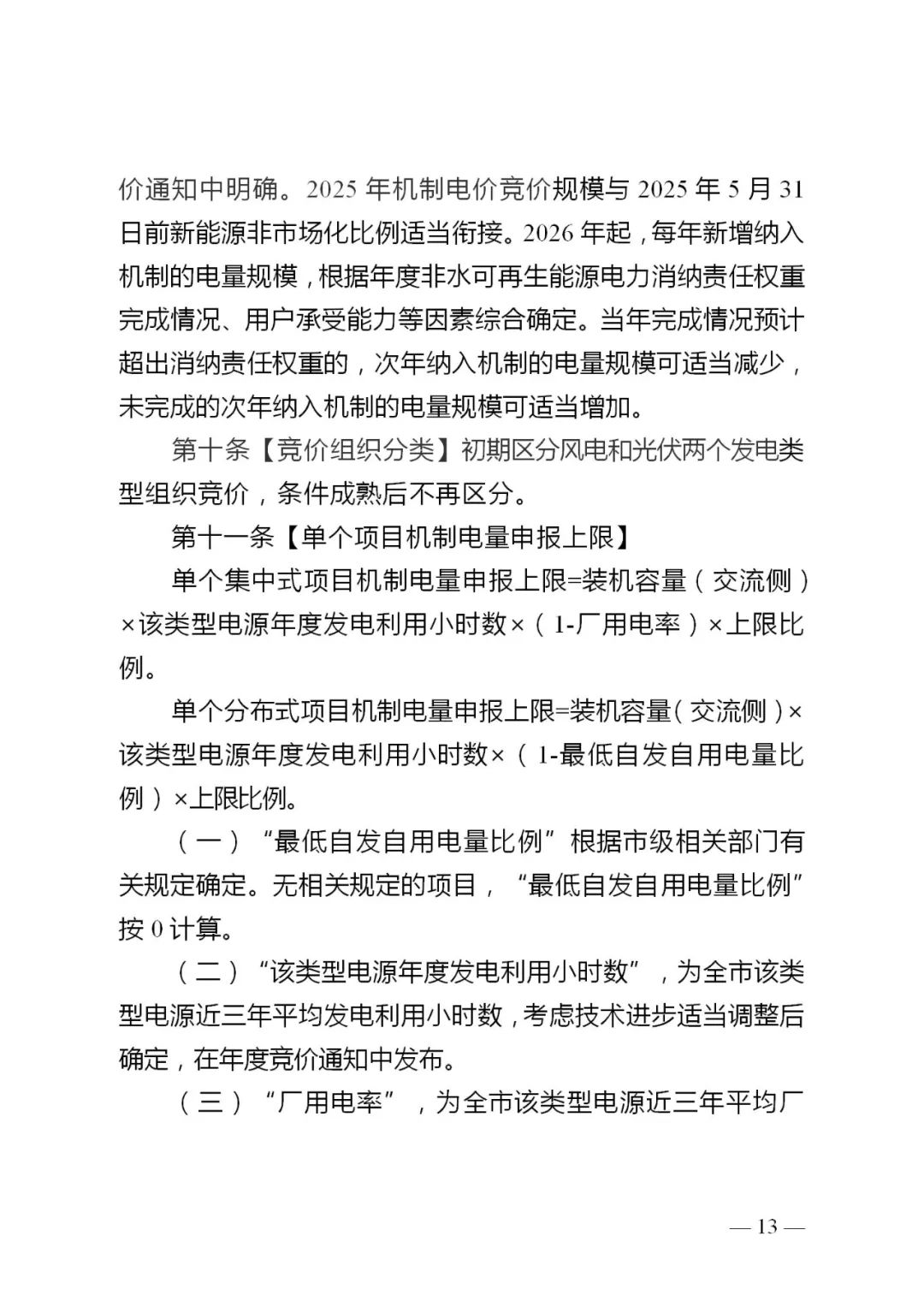 4.电量规模。竞价电量规模根据国家下达的非水可再生能源消纳责任权重完成情况及用户承受能力等因素确定。超出消纳责任权重的,次年纳入机制的电量规模可适当减少;未完成的,次年纳入机制的电量规模可适当增加。第一年纳入机制的电量占增量项目新能源上网电量的比例,与我市现有新能源非市场化比例适当衔接,单个项目申请纳入机制的电量占其全部上网电量的比例应低于100%,具体比例在每年的竞价通知中明确。