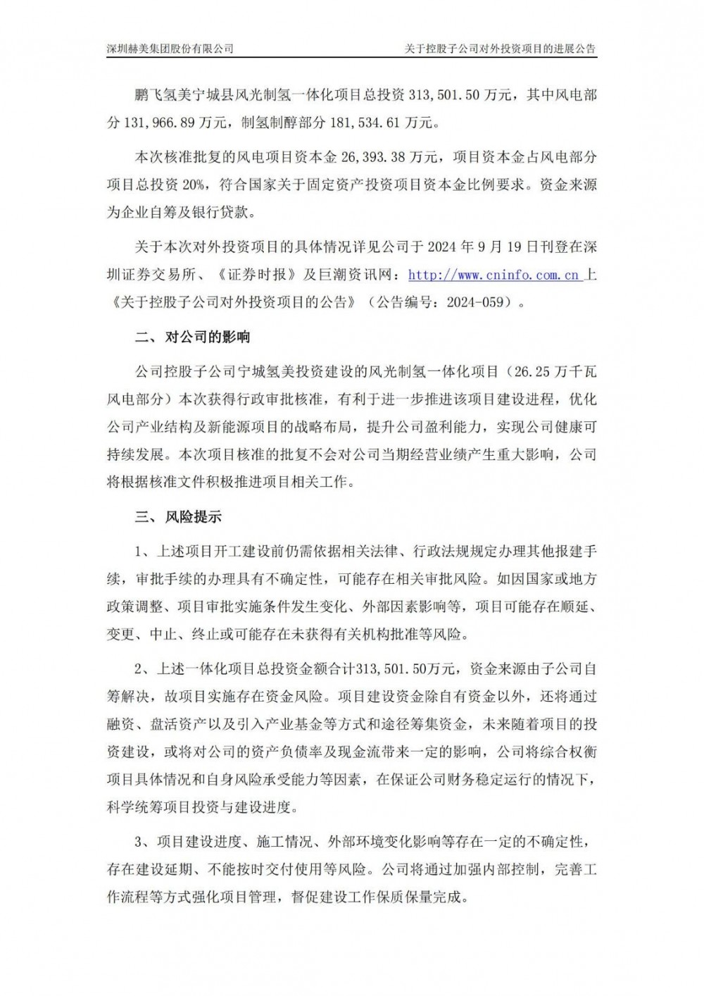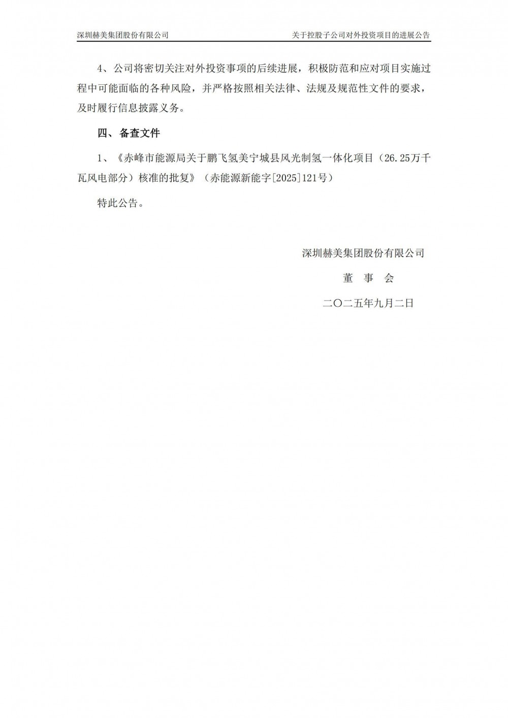 公告显示,深圳赫美集团股份有限公司控股子公司鹏飞氢美(宁城)新能源科技有限公司(简称“宁城氢美”)于近日取得赤峰市能源局发至宁城县发展和改革委员会的《关于鹏飞氢美宁城县风光制氢一体化项目(26.25 万千瓦风电部分)核准的批复》(赤能源新能字[2025]121 号)。