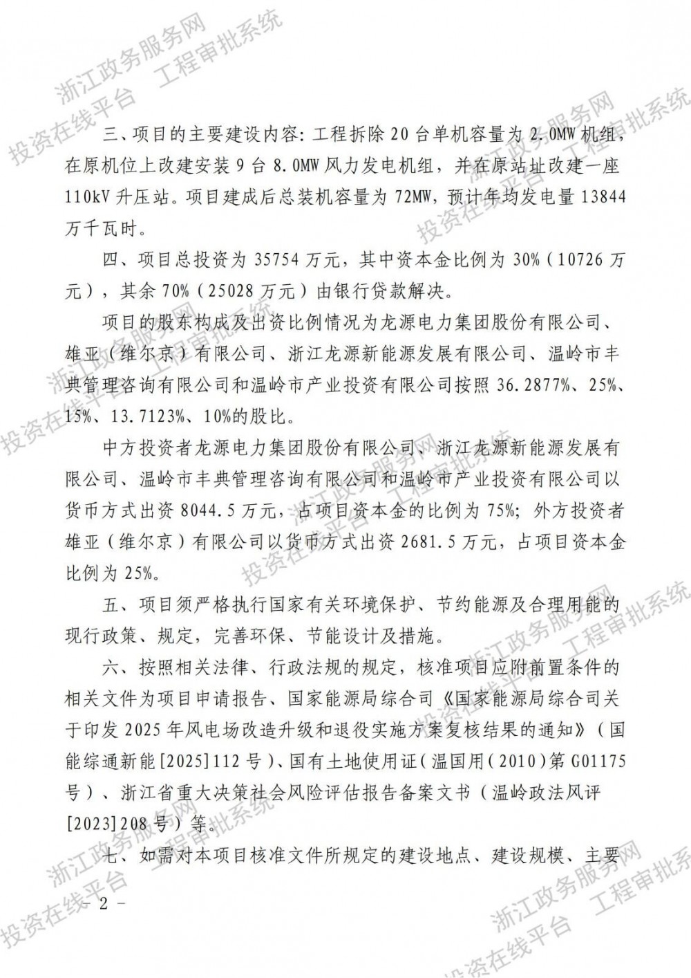 该项目总投资为35754万元,项目实施单位为浙江温岭东海塘风力发电有限公司,该公司由龙源电力集团股份有限公司(36.2877%)、雄亚(维尔京)有限公司(25%)、浙江龙源新能源发展有限公司(15%)、温岭市丰典管理咨询有限公司(13.7123%)和温岭市产业投资有限公司(10%)共同持股。