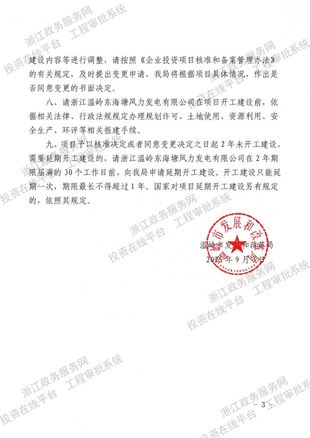 9月3日,浙江省温岭市发展和改革局发布《关于温岭东海塘风电场改造升级建设项目核准的批复》。