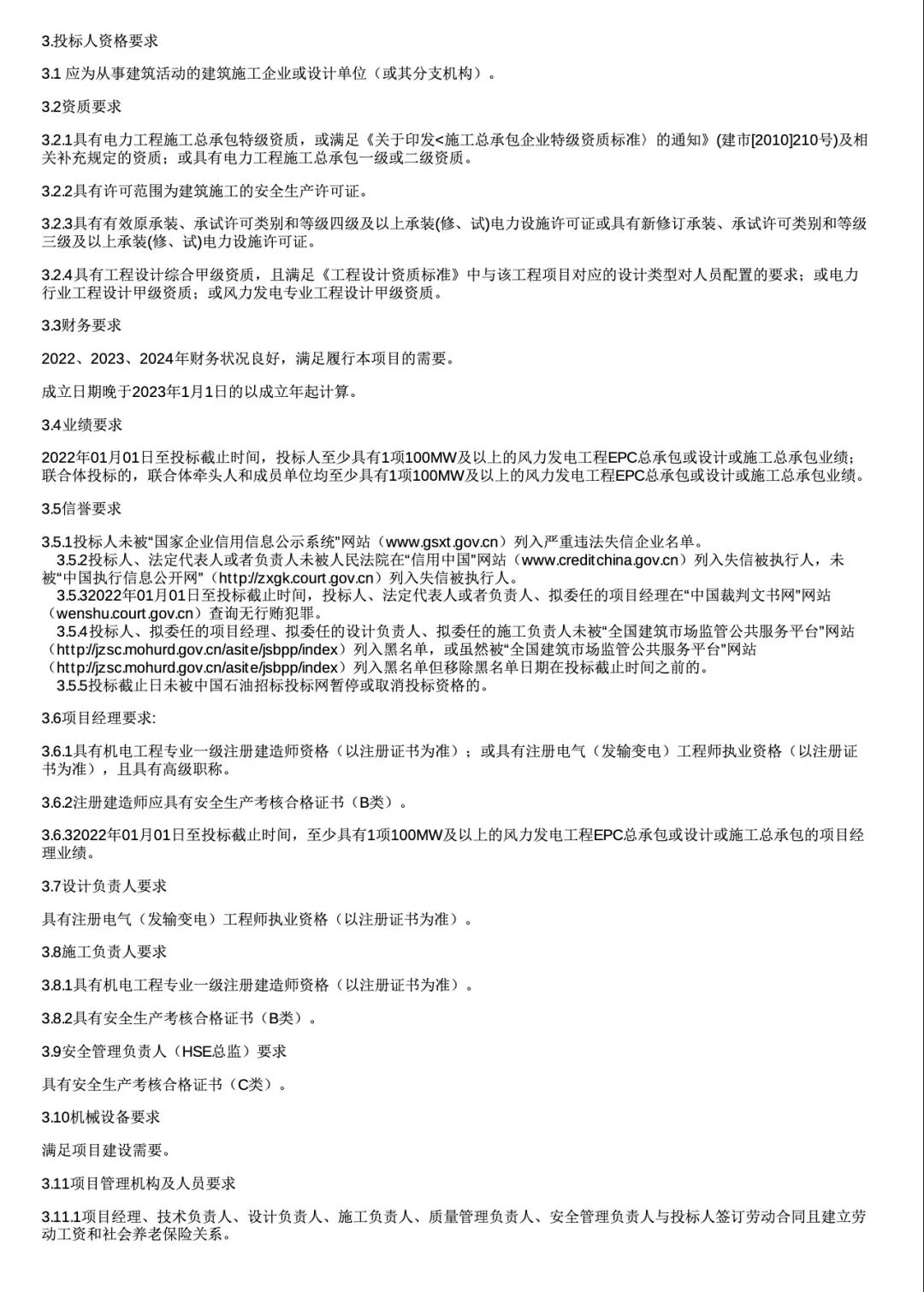 招标分为三个标段:一标段为64台风机40万千瓦风力发电场区设计、采购及施工; 二标段为56台风机35万千瓦风力发电场区设计、采购及施工; 三标段为40台风机25万千瓦风力发电场区设计、采购及施工;