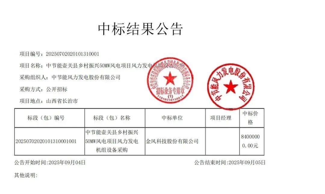 金风科技报价8400万,中标中节能壶关县乡村振兴50MW风电项目,其中标风机和配套设备共8台,中标单价1680元/kW。项目地点位于山西长治市壶关县。相应等设备需要在2026年8月31日前完成交付。