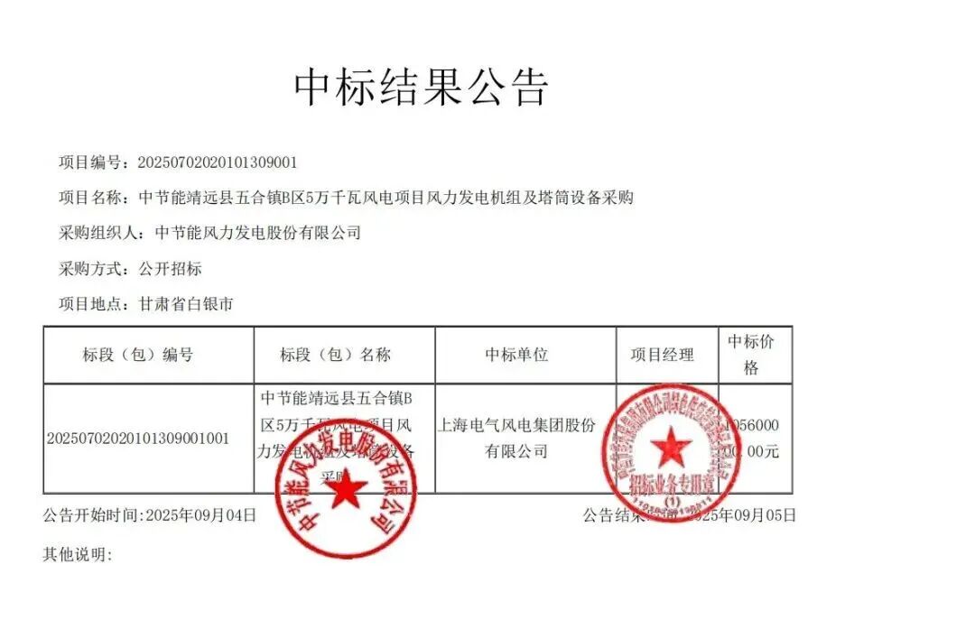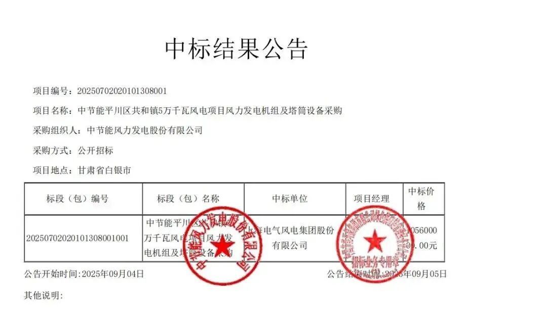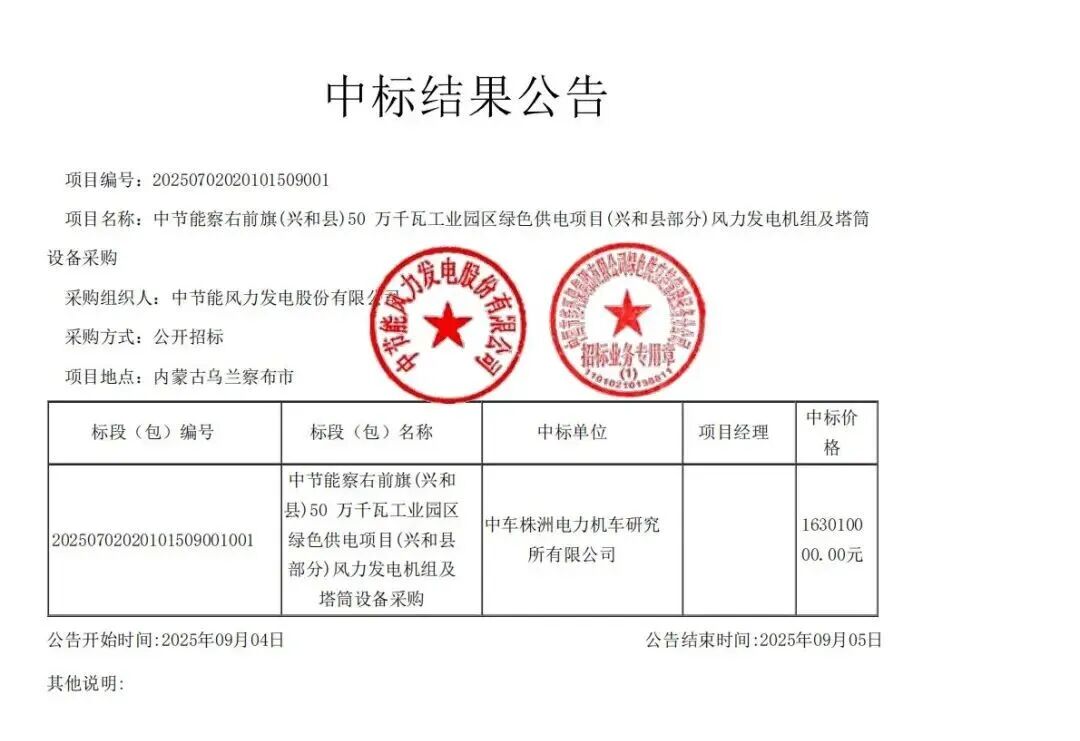 中车株洲所报价16301万,中标中节能察右前旗(兴和县)50 万千瓦工业园区绿色供电项目(兴和县部分),中标风机和配套设备8台,中标单价1630元/kW。首批机组(3台)2026年6月15日到场;其他机组由招标人提前30日书面方式通知。 2026年10月31日前完成全部合同机组交付。