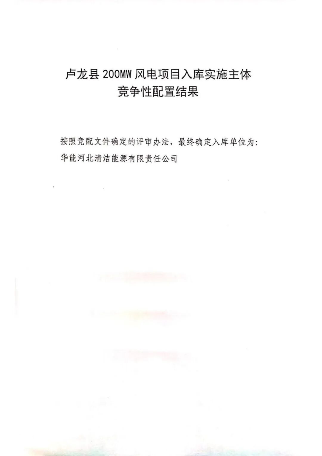 根据公示,按照竞配文件确定的评审办法,最终确定入库单位为:华能河北清洁能源有限责任公司。