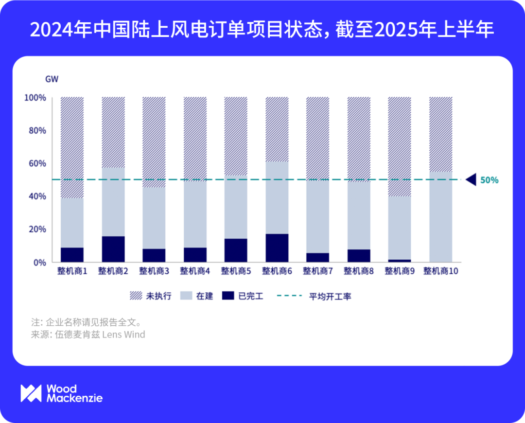 根据伍德麦肯兹统计,2024年签订的166GW陆上风机订单中,已有超半数的订单转化为已开工项目。海上风电受用海冲突和风机大型化趋势影响,项目建设进度仍显滞后。
