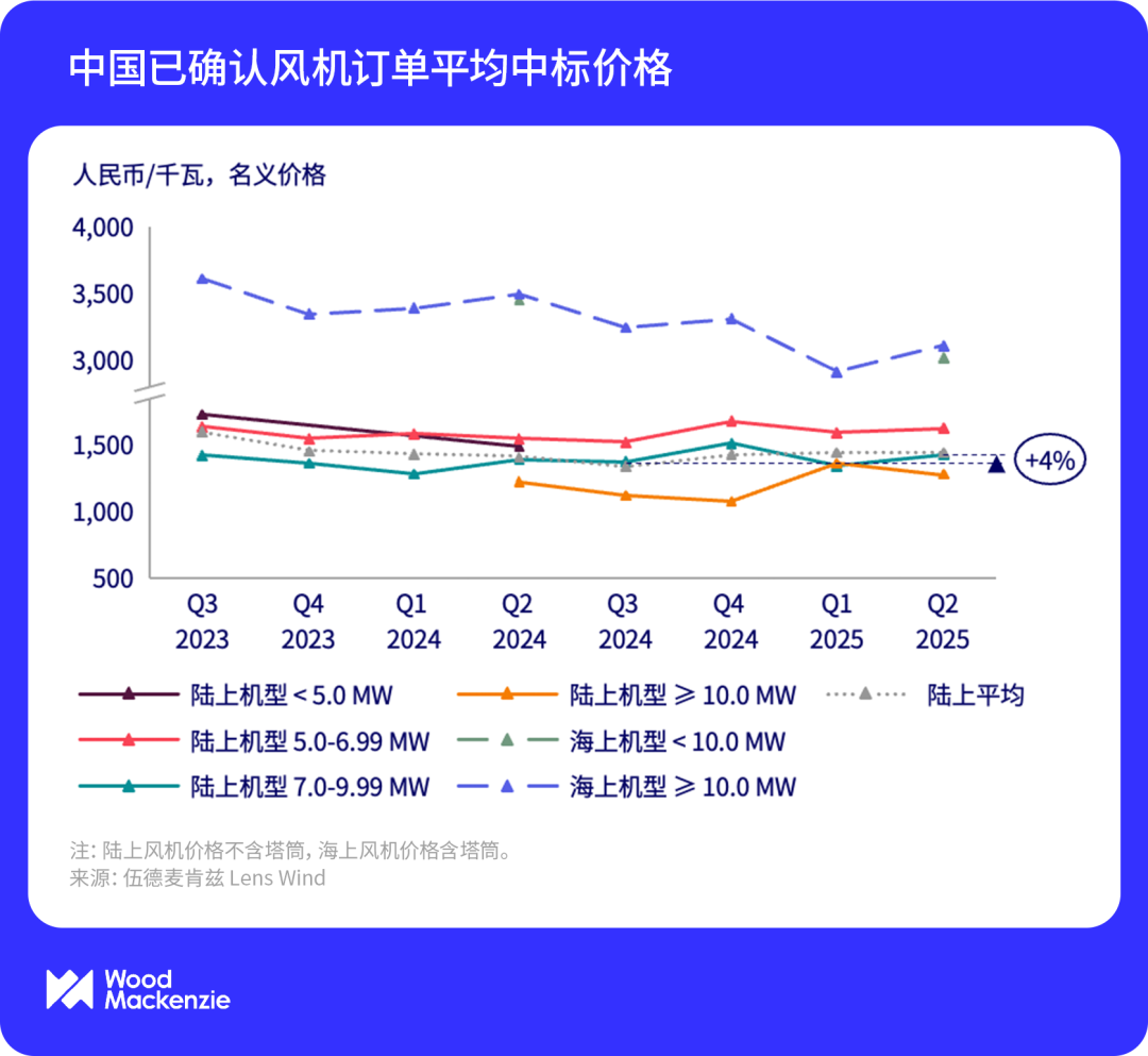 2025年上半年,10MW以上陆上风机订单同比下降14%,而7-10MW机型份额显著提升,低风速机型需求增长。机组大型化趋势的放缓,推动陆上风机价格连续三个季度回升,2025年第二季度的价格较2024年最低点回升4%。