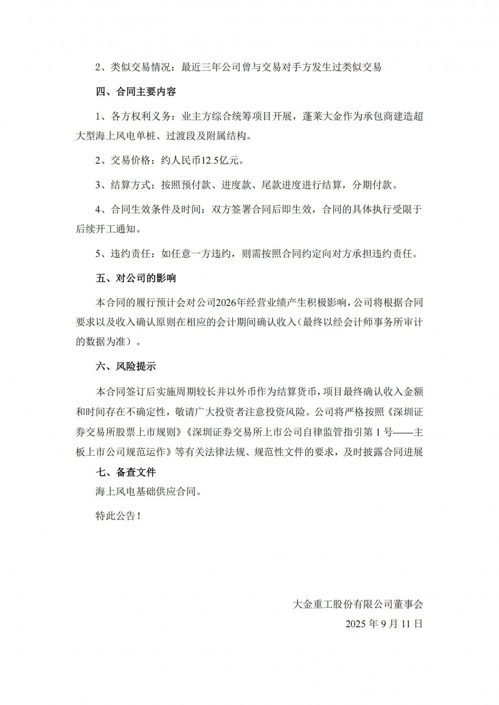 近日,蓬莱大金与该海上风电开发商签署了本协议下首个海上风电基础供应合同,蓬莱大金将为某海外海上风电项目提供超大型海上风电单桩、过渡段及附属结构,合同总金额折合人民币约 12.5 亿元,占公司 2024 年度经审计营业收入的比例约33%。