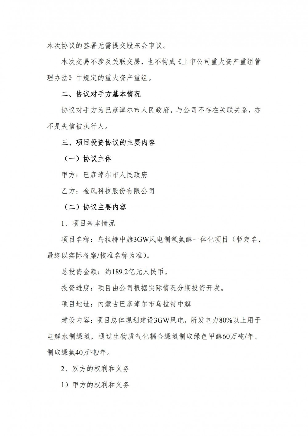 公告显示,2025年9月10日,金风科技召开第九届董事会第五次会议,审议通过了《关于金风科技乌拉特中旗3GW风氢氨醇一体化项目签订投资协议并开展申报工作的议案》,同意公司基于内蒙古风氢氨醇一体化项目申报政策要求,进行项目申报及获取项目开发权。