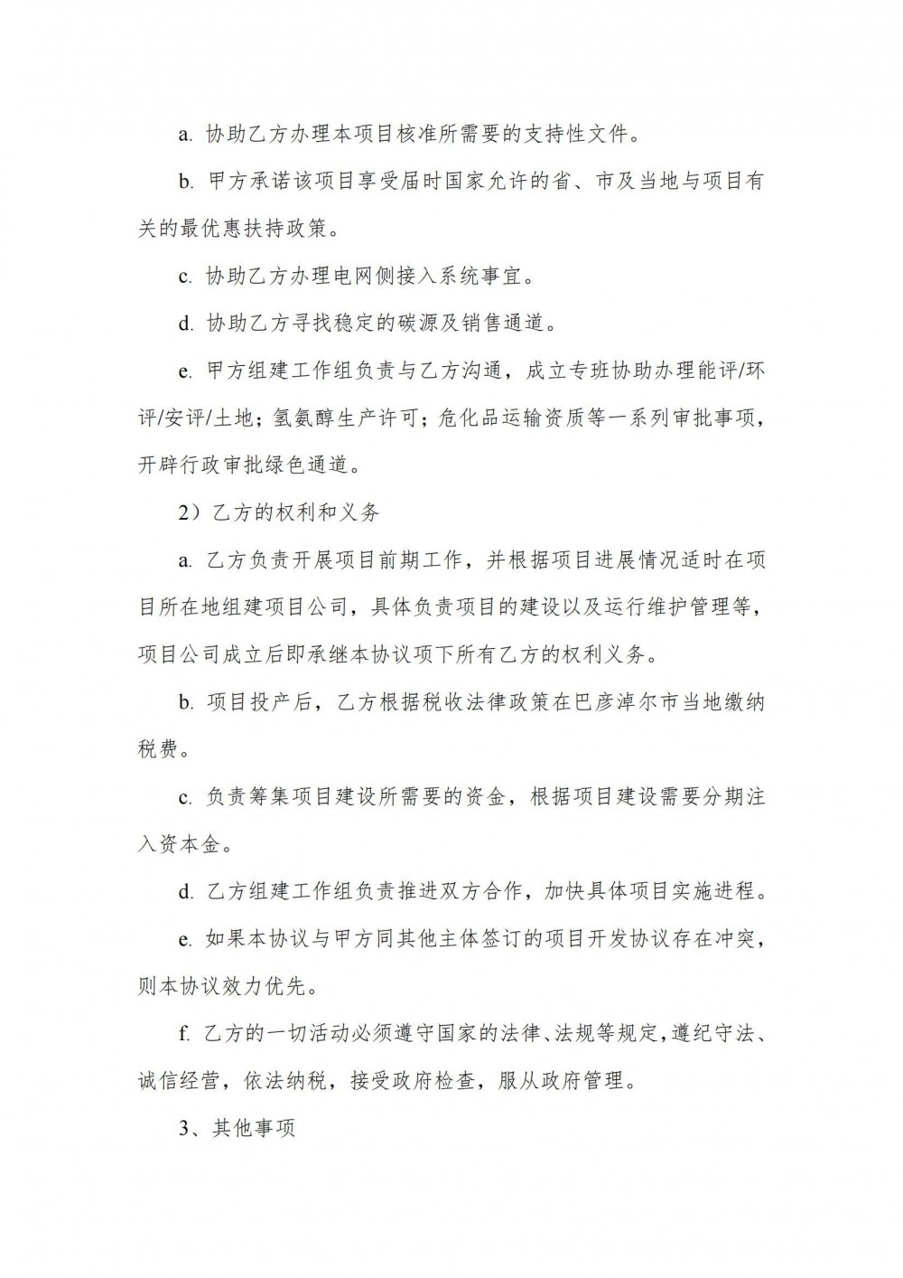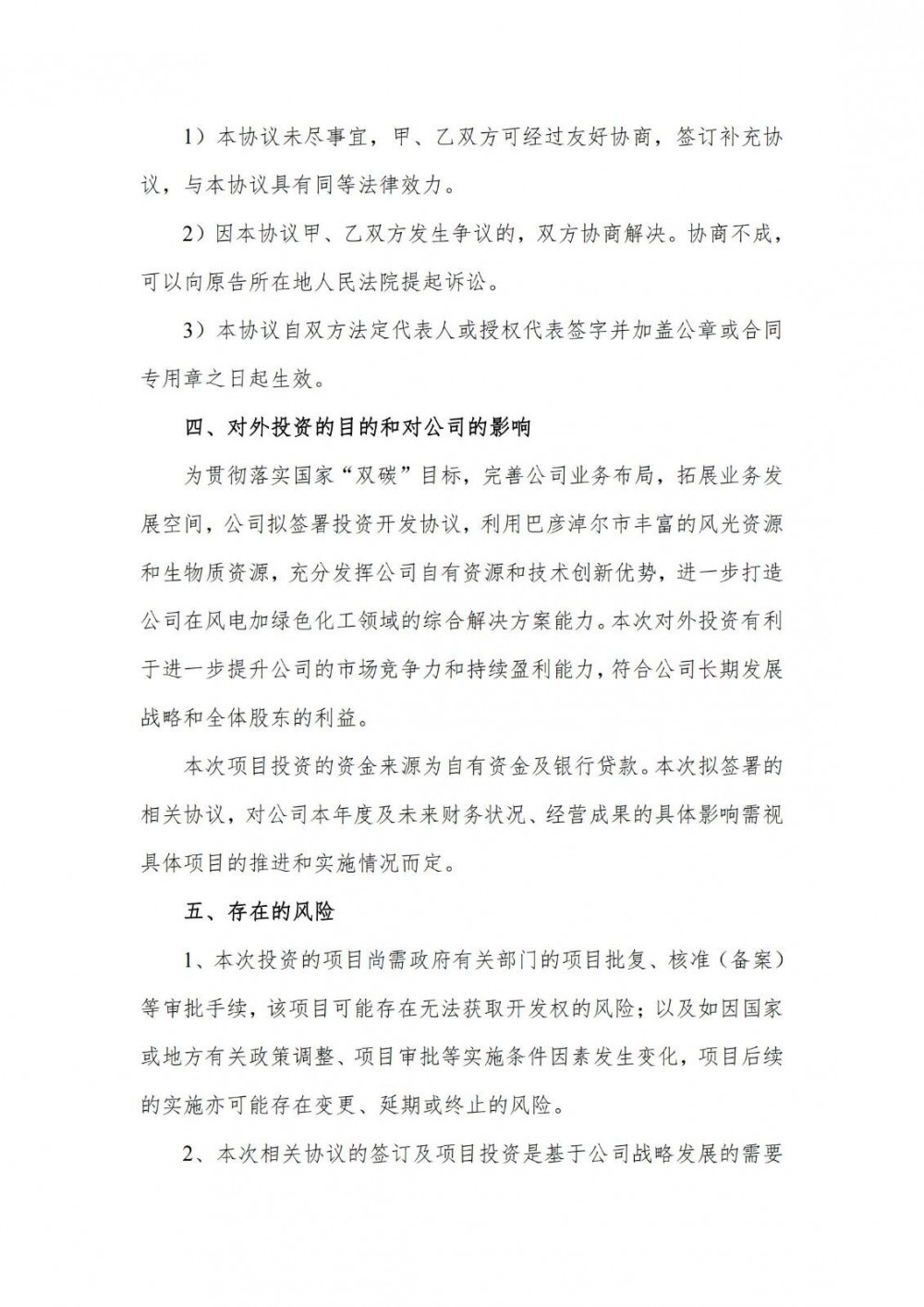 公司拟与巴彦淖尔市人民政府签订《风电制氢氨醇一体化项目投资开发协议书》,计划在巴彦淖尔市辖区内投资建设风电制氢氨醇项目,总投资金额约为189.2亿元人民币。