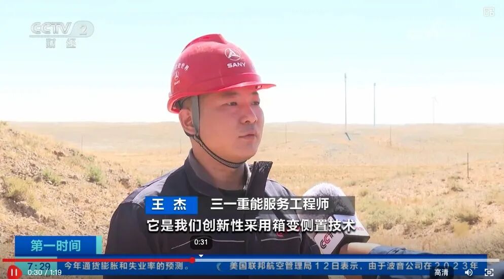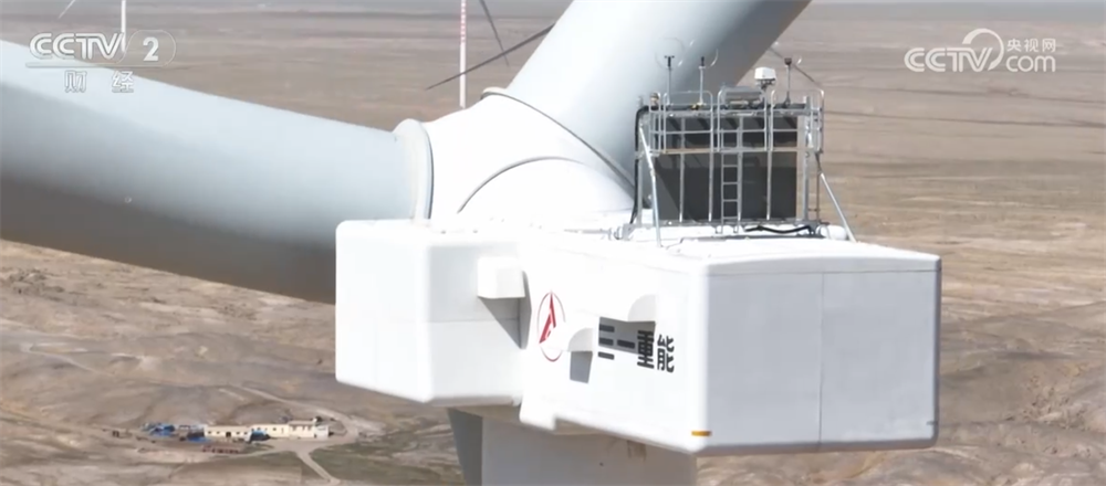 三一重能服务工程师王杰称:“我们这个主机两侧多了2个‘耳朵’,它是我们创新性采用箱变侧置技术,让机组承载载荷更优化,我们采用强度更优的双轴承,让传动链运行更加稳定可靠。机组重量减轻5%以上。”