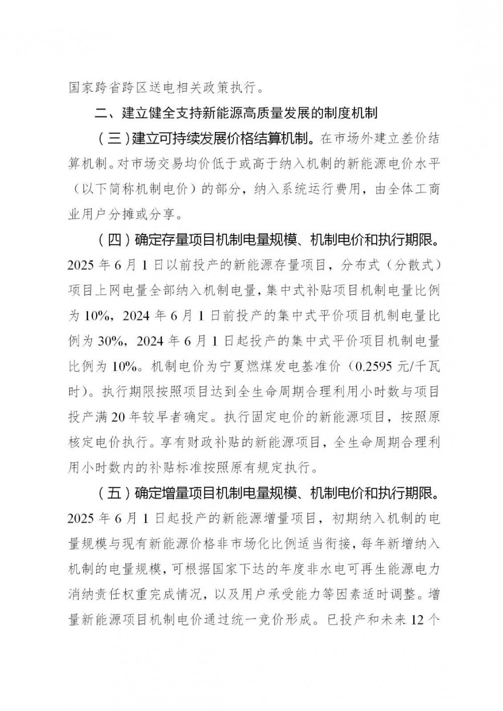 机制电量:2025年6月1日起投产的新能源增量项目,初期纳入机制的电量规模与现有新能源价格非市场化比例适当衔接,每年新增纳入机制的电量规模,可根据国家下达的年度非水电可再生能源电力消纳责任权重完成情况,以及用户承受能力等因素适时调整。