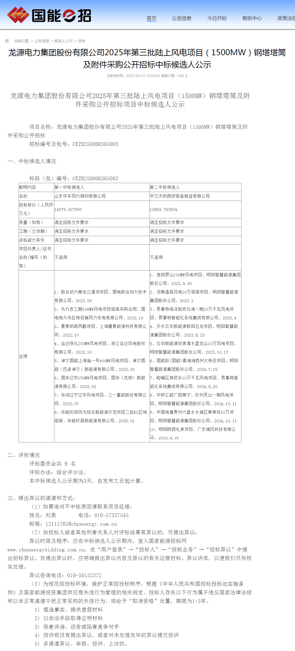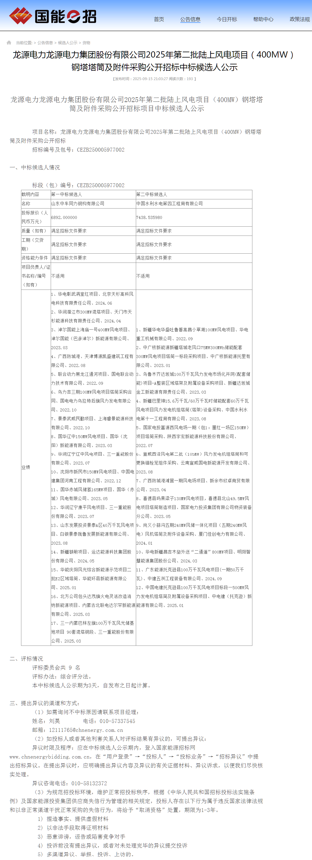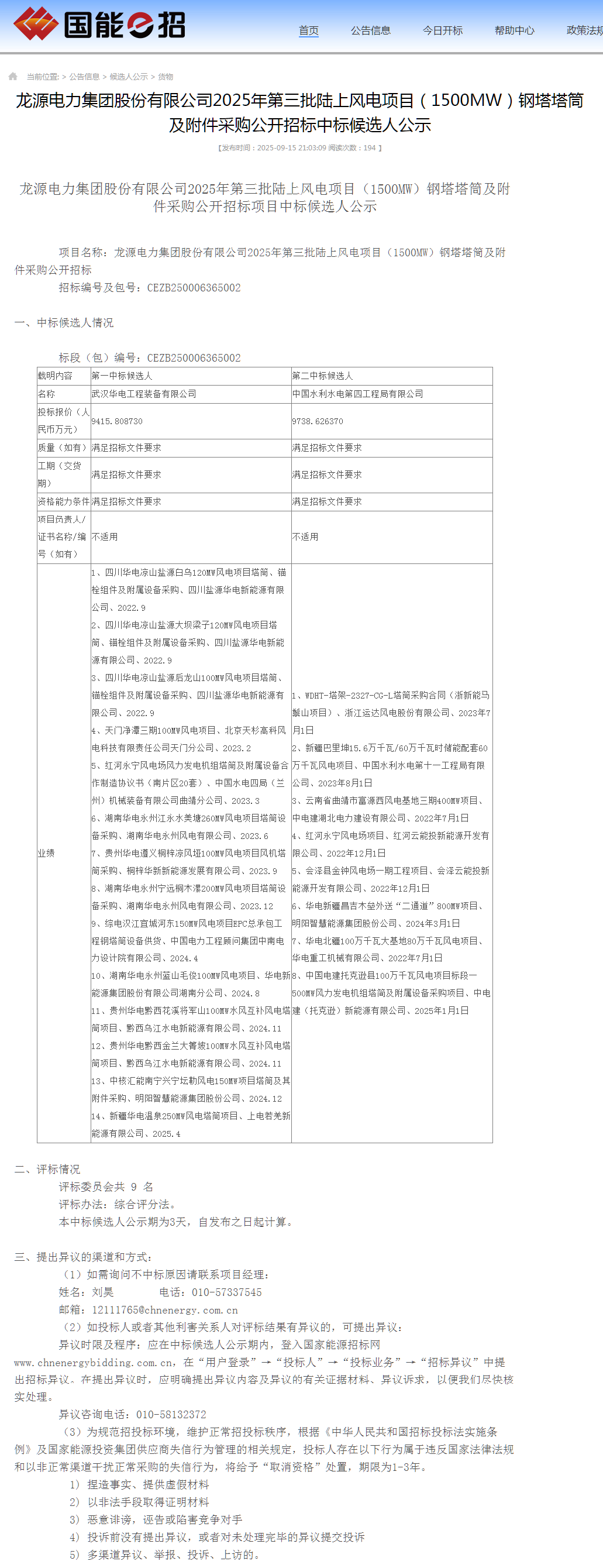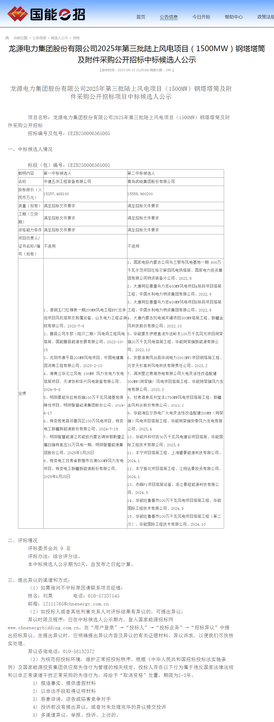 能源圈获悉,9月15日,国家能源集团、中国能建累计1323.2MW风电项目塔筒采购中标候选人公示。