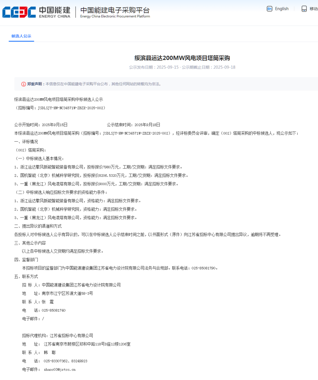 根据公示,武汉华电工程装备有限公司、山东中车同力钢构有限公司、中建五洲工程装备有限公司、浙江运达擎风新能智能装备有限公司作为第一中标候选人预中标。