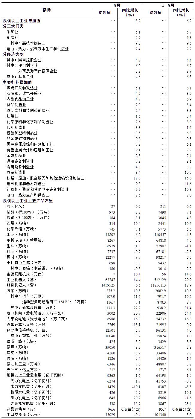 分行业看,8月份,41个大类行业中有31个行业增加值保持同比增长。其中,煤炭开采和洗选业增长5.1%,石油和天然气开采业增长4.7%,农副食品加工业增长4.7%,酒、饮料和精制茶制造业下降2.4%,纺织业增长1.5%,化学原料和化学制品制造业增长7.6%,非金属矿物制品业增长0.5%,黑色金属冶炼和压延加工业增长7.3%,有色金属冶炼和压延加工业增长9.1%,通用设备制造业增长7.3%,专用设备制造业增长4.0%,汽车制造业增长8.4%,铁路、船舶、航空航天和其他运输设备制造业增长12.0%,电气机械和器材制造业增长9.8%,计算机、通信和其他电子设备制造业增长9.9%,电力、热力生产和供应业增长2.5%。