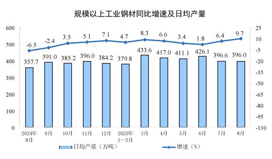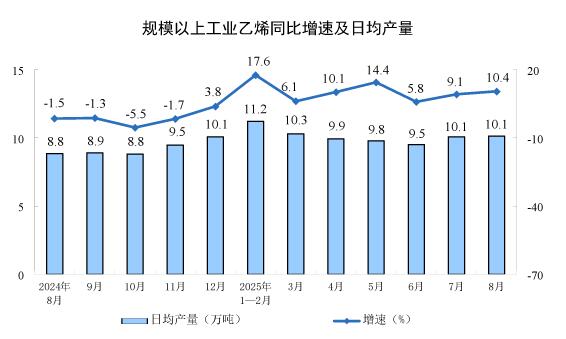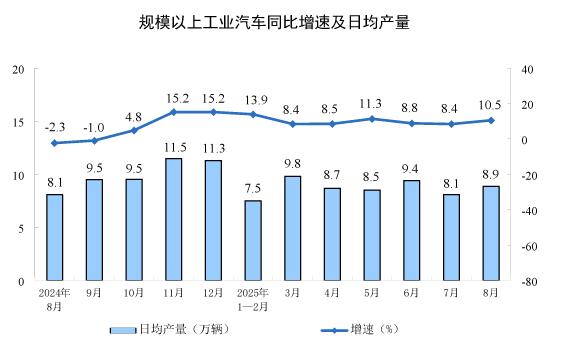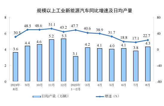 分产品看,8月份,规模以上工业623种产品中有319种产品产量同比增长。其中,钢材12277万吨,同比增长9.7%;水泥14802万吨,下降6.2%;十种有色金属698万吨,增长3.8%;乙烯314万吨,增长10.4%;汽车275.2万辆,增长10.5%,其中新能源汽车133.3万辆,增长22.7%;发电量9363亿千瓦时,增长1.6%;原油加工量6346万吨,增长7.6%。