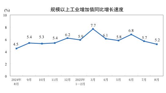 9月15日,国家统计局发布2025年8月份规模以上工业增加值增长5.2%。