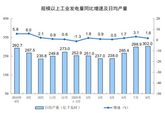 内容指出,2025年8月,全国规模以上工业绝对发电量为9363亿千瓦时,同比增长1.6%;1-8月份,全国规模以上工业绝对发电量为64193亿千瓦时,同比增长1.5%。其中,8月份规模以上工业风力发电量645亿千瓦时,同比增长20.2%。1-8月份规模以上工业风力发电量6966亿千瓦时,同比增长11.6%。8月份规模以上工业太阳能发电量538亿千瓦时,同比增长15.9%。1-8月份规模以上工业太阳能发电量为3867亿千瓦时,同比增长23.4%。