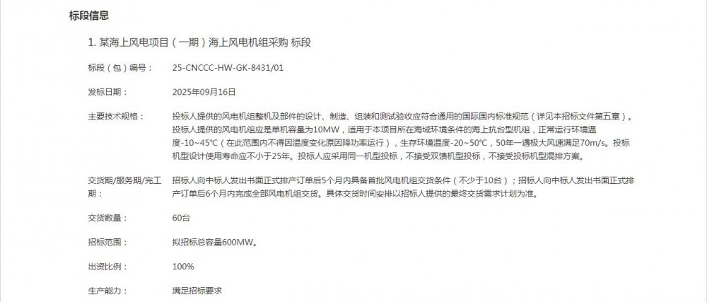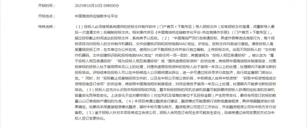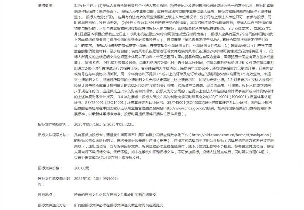 9月17日,中国海洋石油集团有限公司采办业务管理与交易系统发布某海上风电项目(一期)海上风电机组采购招标公告。