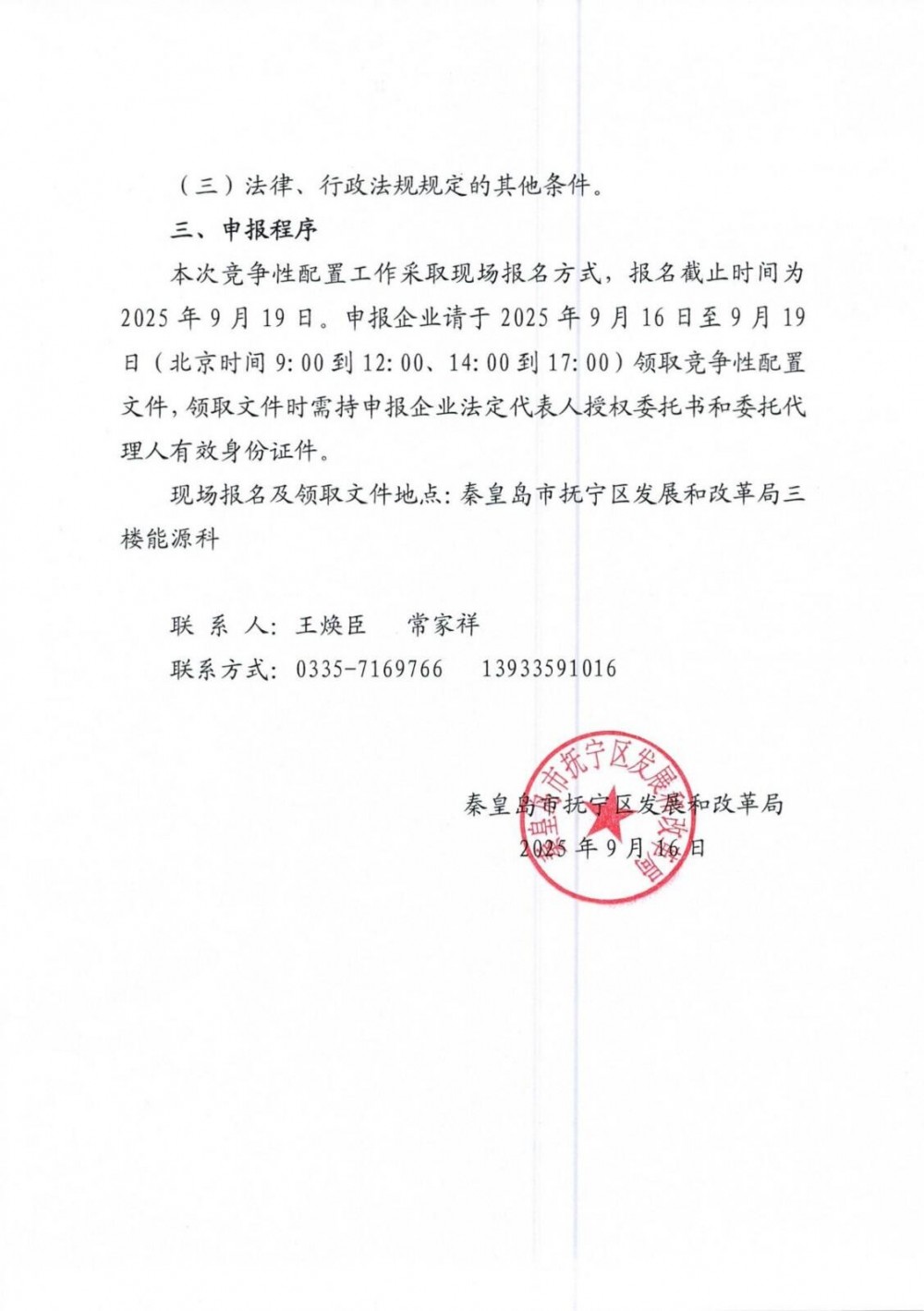 公告显示,根据省、市发改委《关于组织开展绿电直连项目申报工作的通知》精神,现组织开展抚宁区50MW绿电直连风电项目申报企业竞争性配置工作,欢迎有意愿、有能力,符合相关要求的企业报名参加。