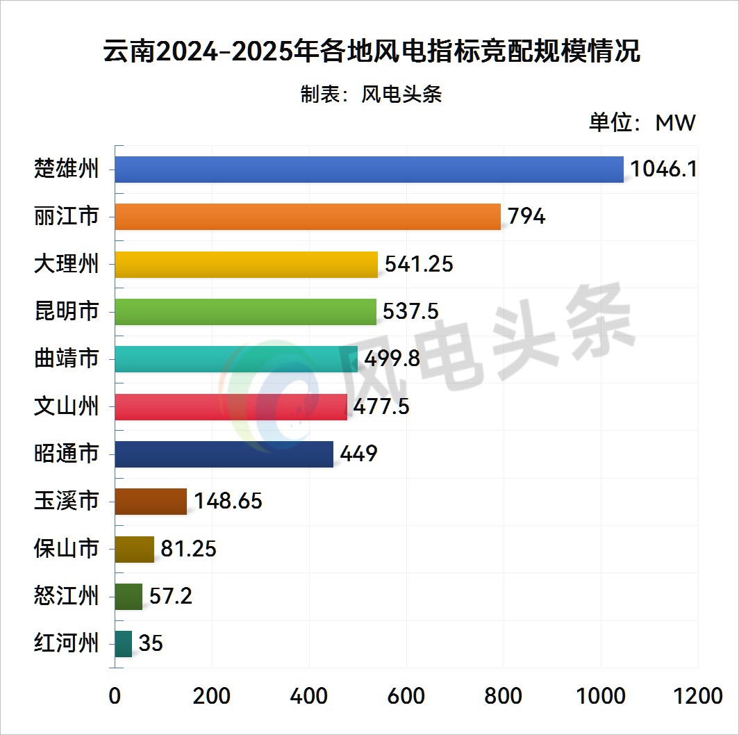 从各市/州完成风电项目竞配情况来看,楚雄州以1046.1MW位列第一,丽江市以794MW排名第二,大理州以541.25MW位列第三。