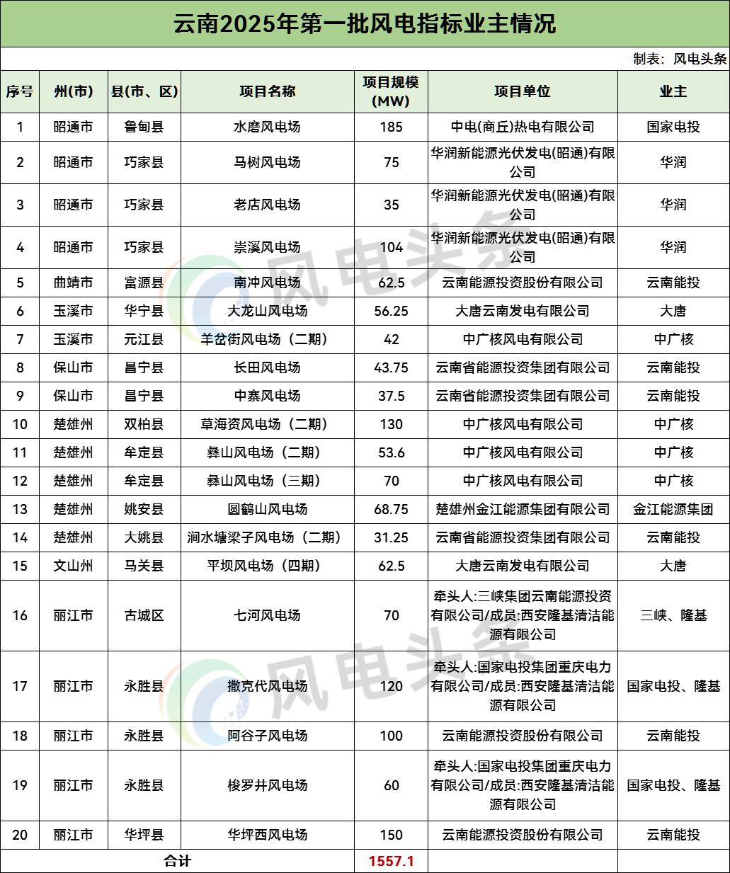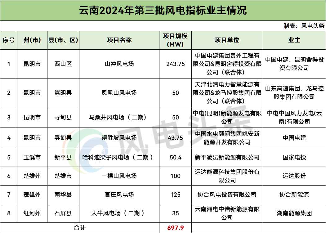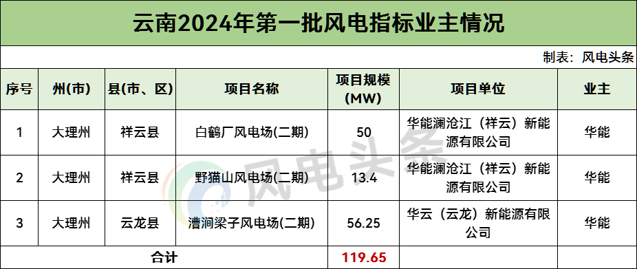 从业主方面来看,中广核、云南能投、国家电投、大唐、华能、华润、中国电建等企业或联合体获得风电指标。