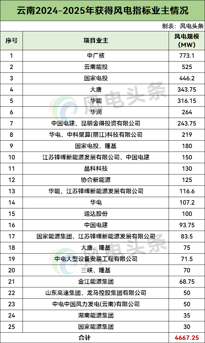 据能源圈不完全统计,截至目前,共计4667.25MW风电项目确定业主。