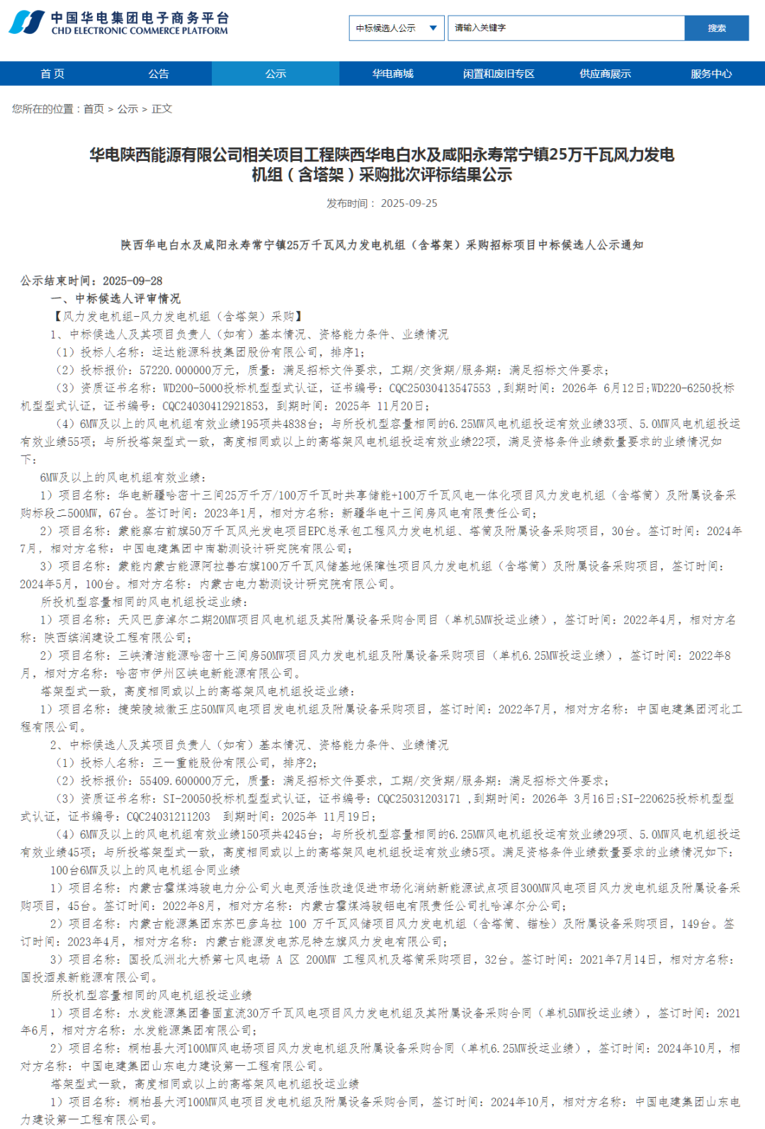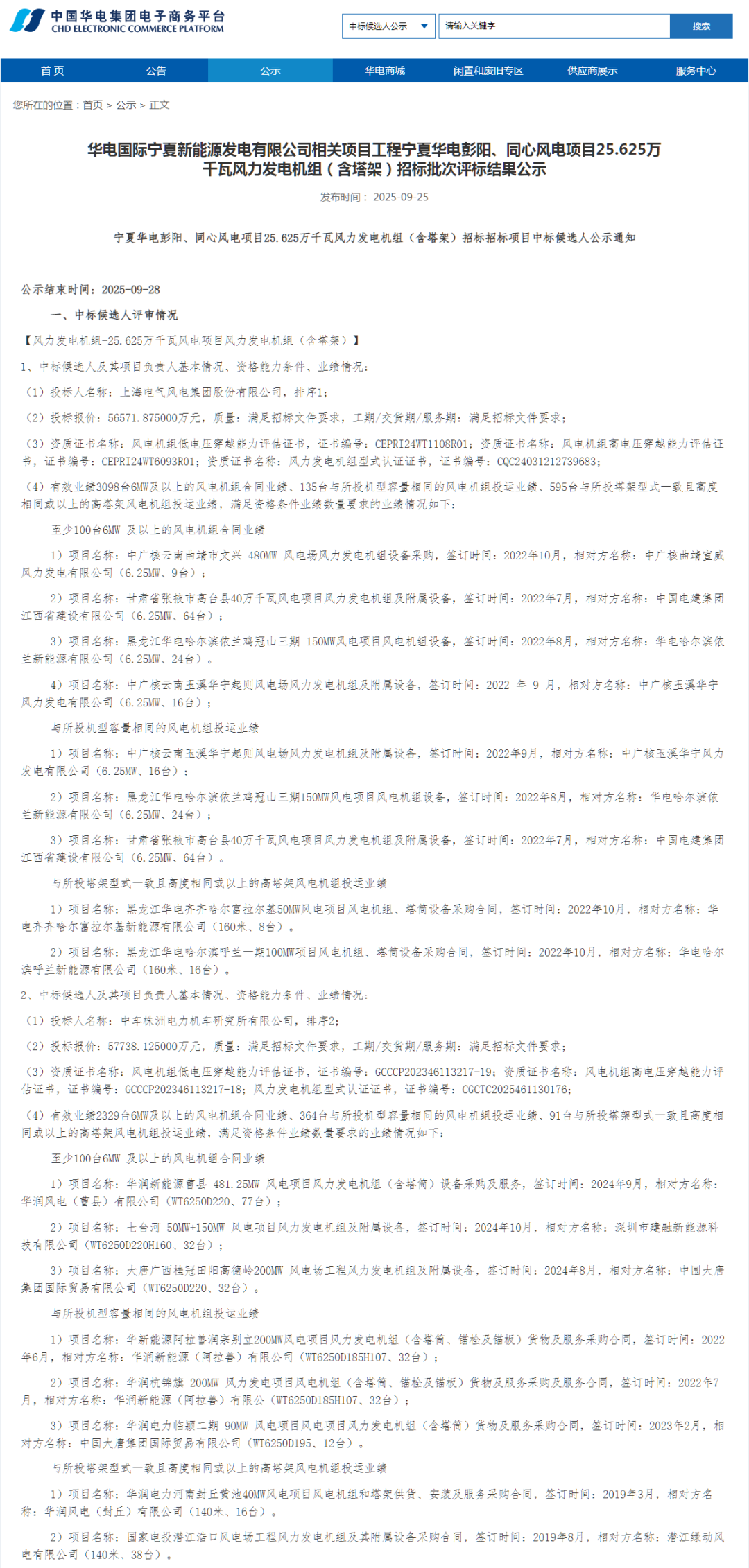 能源圈获悉,9月25日,华电集团电子商务平台8个风电项目风电机组采购中标候选人公示,规模合计1565MW。