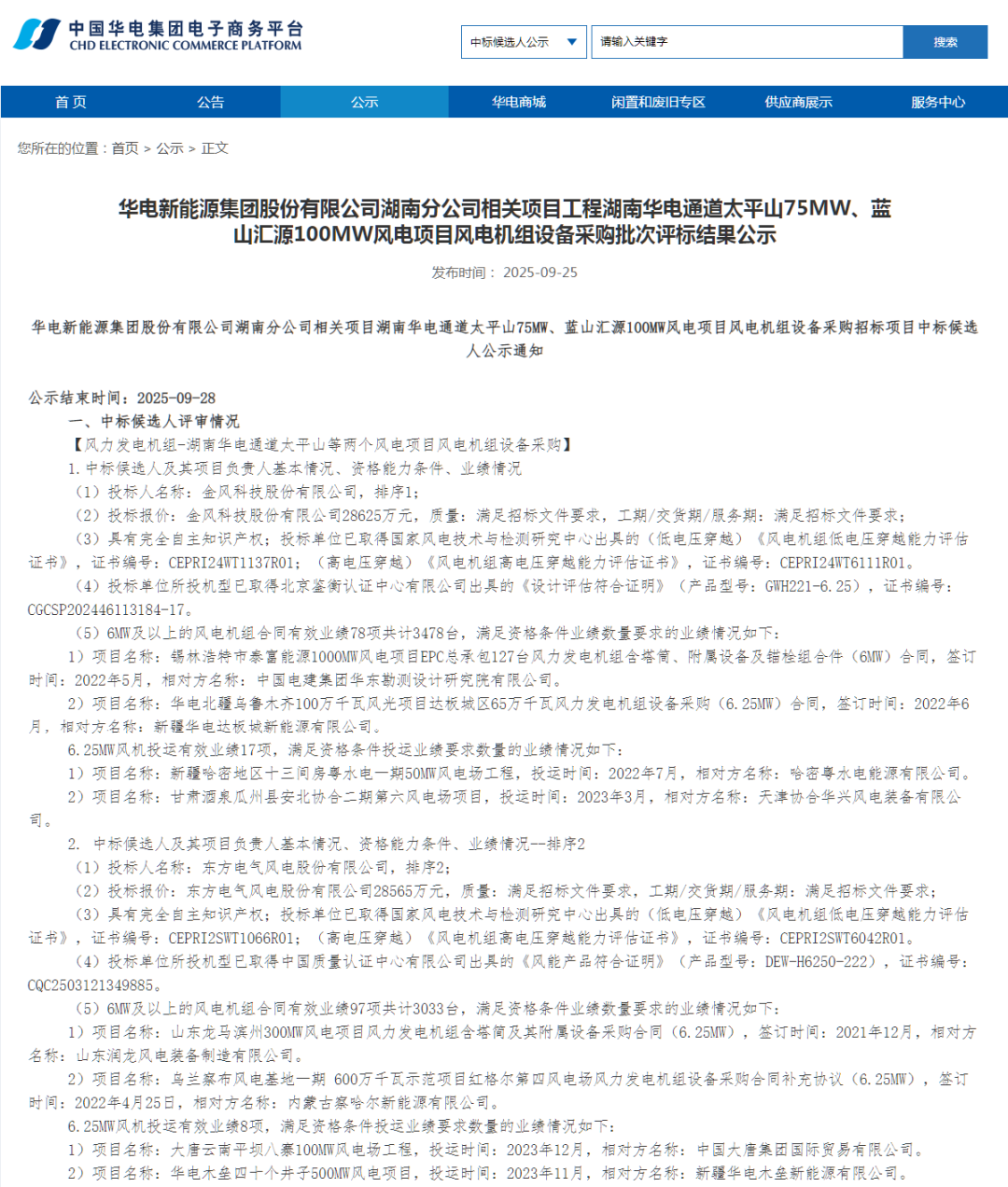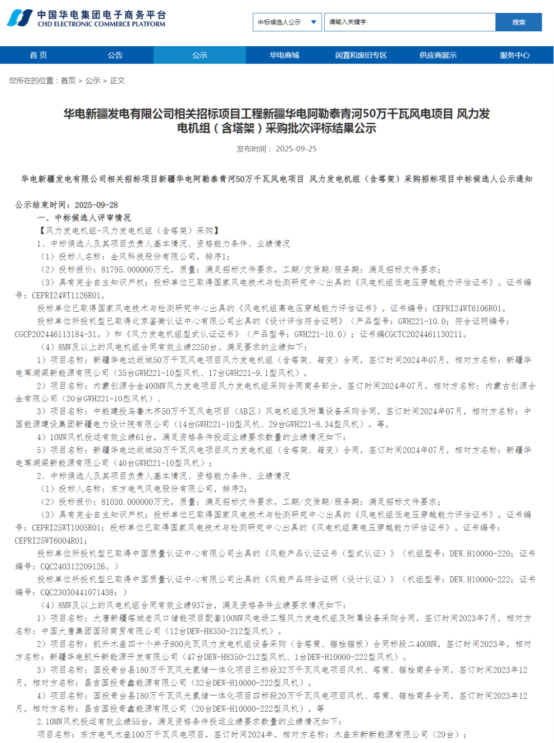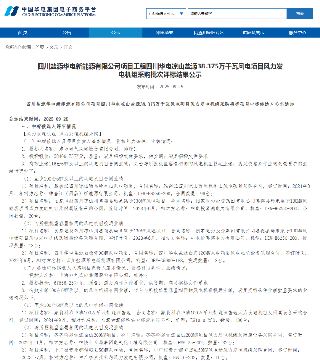 根据公示,金风科技、东方风电、电气风电、运达股份作为第一中标候选人预中标。
