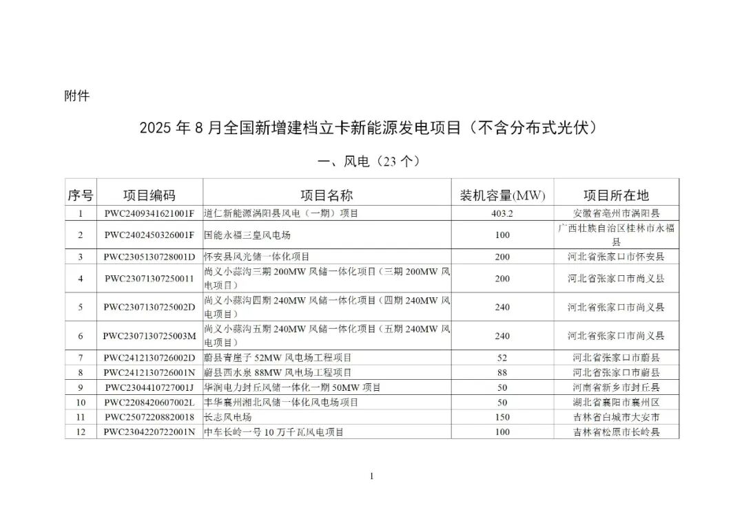 2025年8月,全国新增建档立卡新能源发电(不含户用光伏)项目共8658个,其中风电项目23个,光伏发电项目8624个(集中式光伏发电项目50个,工商业分布式光伏发电项目8574个),生物质发电项目11个。风电、集中式光伏发电、生物质发电项目清单见附件,工商业分布式光伏发电项目清单详见可再生能源发电项目信息管理平台网站(网址https://jdlk.renewable.org.cn/card-info-sheet/)。