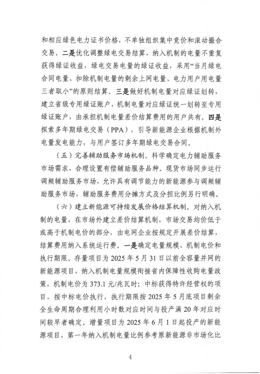 存量项目为2025年5月31日以前全容量并网的新能源项目,纳入机制电量规模衔接省内保障性收购电量政策,机制电价为373.1元/兆瓦时;中标获得特许经营权的项目,按中标电价执行。