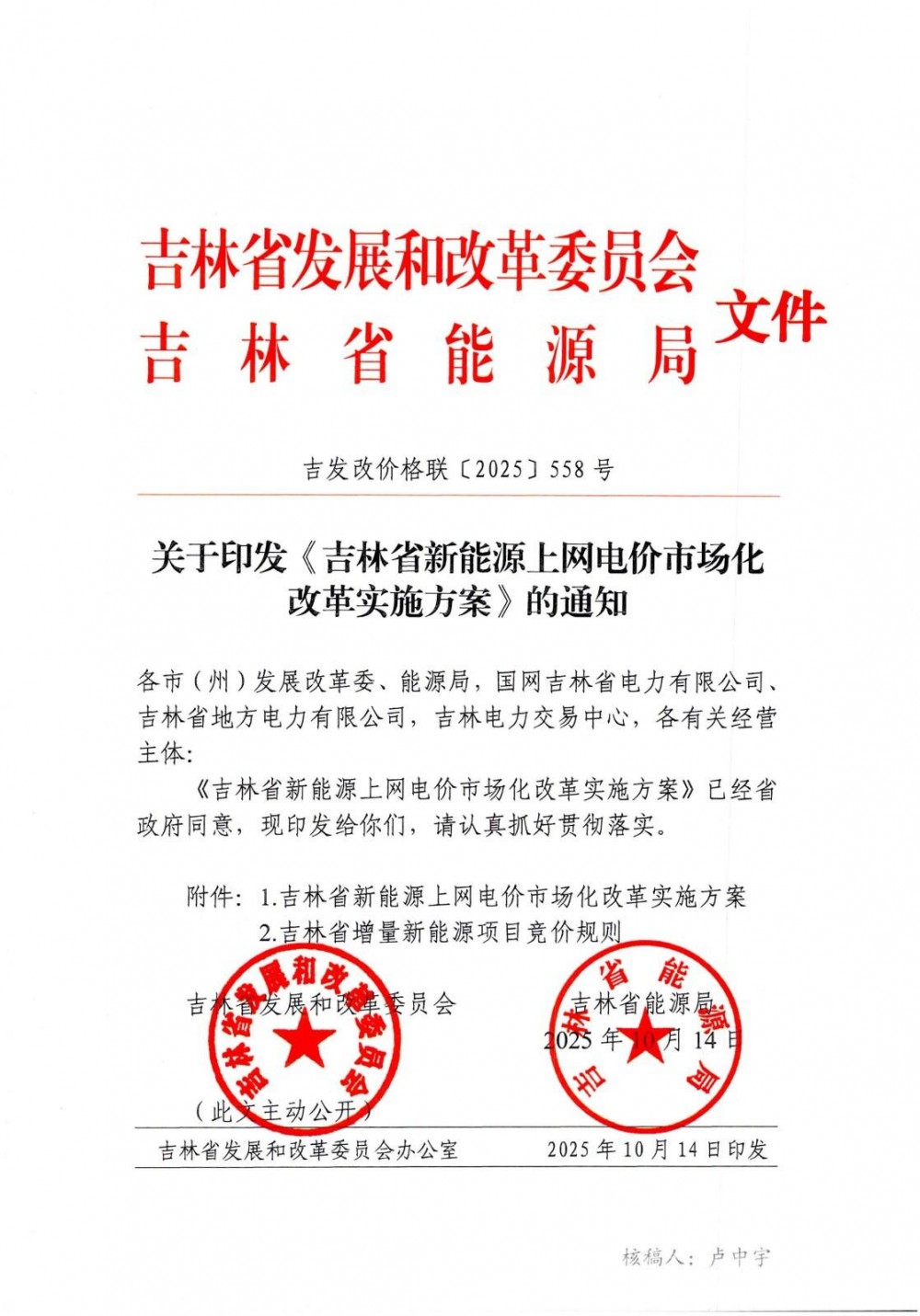 10月15日,吉林省发展和改革委员会、吉林省能源局发布《吉林省新能源上网电价市场化改革实施方案》、《吉林省增量新能源项目竞价规则》。