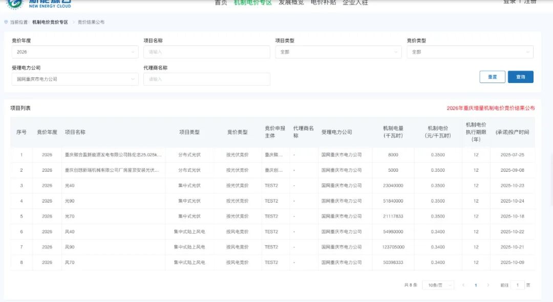 近日,国网新能源云平台公布重庆市2026年度风电竞价结果,根据公示内容显示,风电价格为0.34元/千瓦时,光伏价格为0.35元/千瓦时。根据公示的项目计算,有3个风电项目竞价结果出台,合计规模约2.29亿千瓦时。