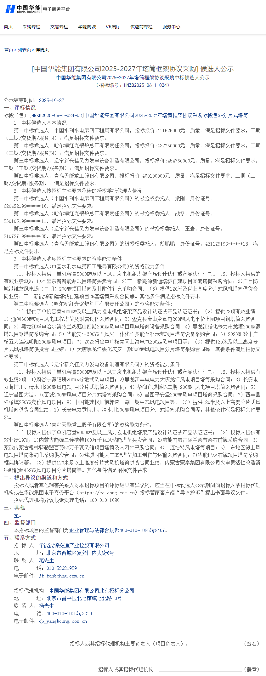 能源圈获悉,10月23日,中国华能集团有限公司2025-2027年塔筒框架协议采购候选人公示。