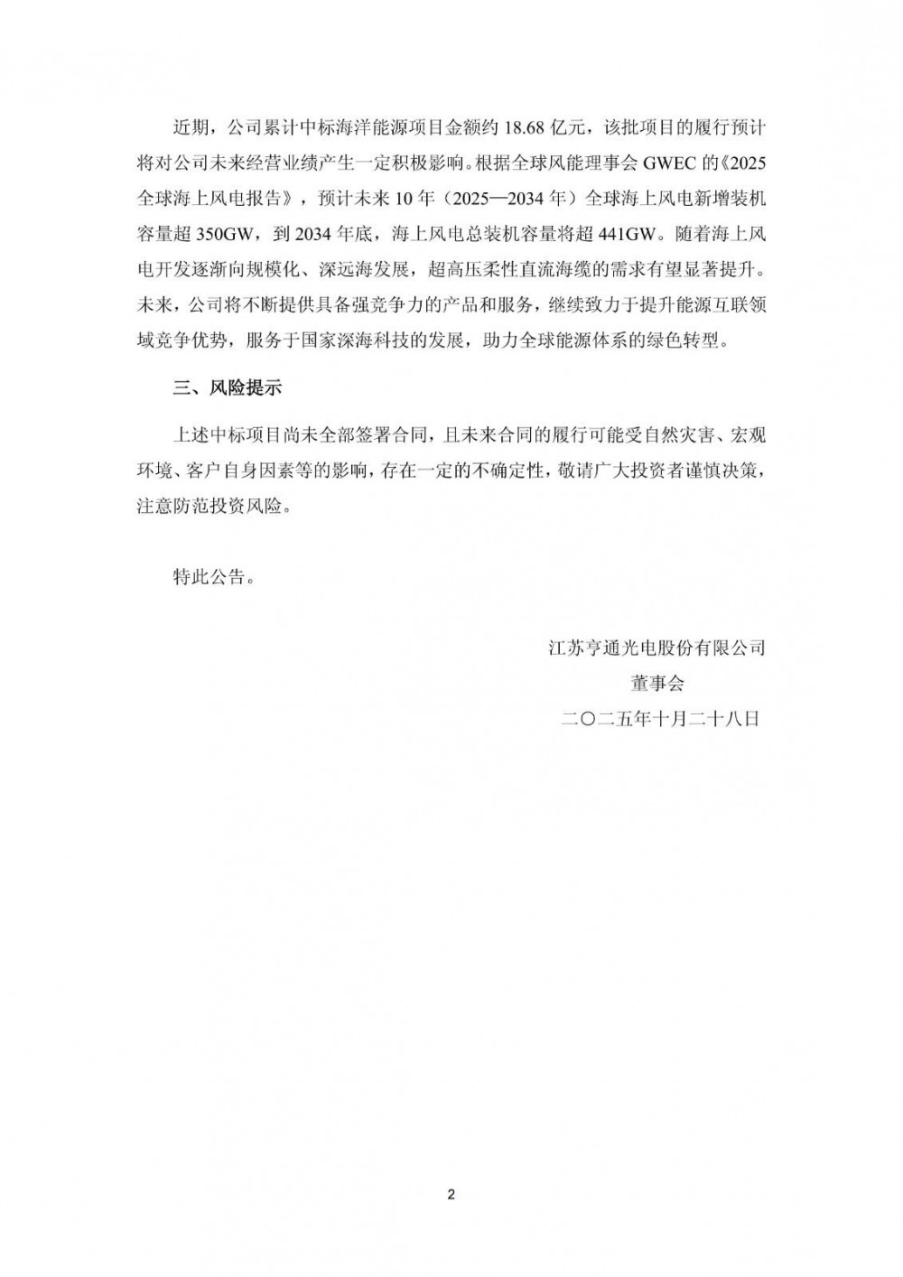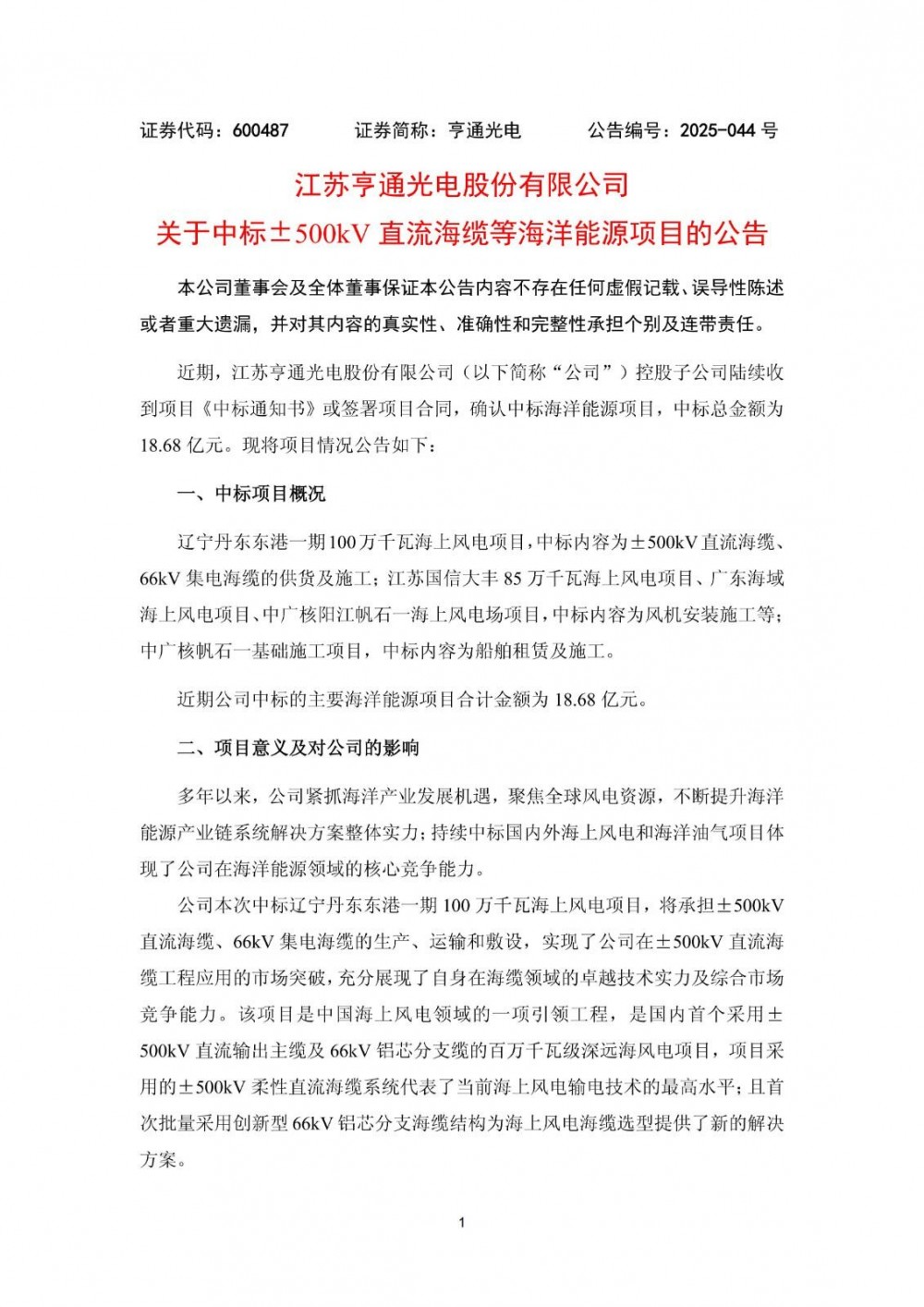 10月28日,江苏亨通光电股份有限公司发布关于中标±500kV直流海缆等海洋能源项目的公告。