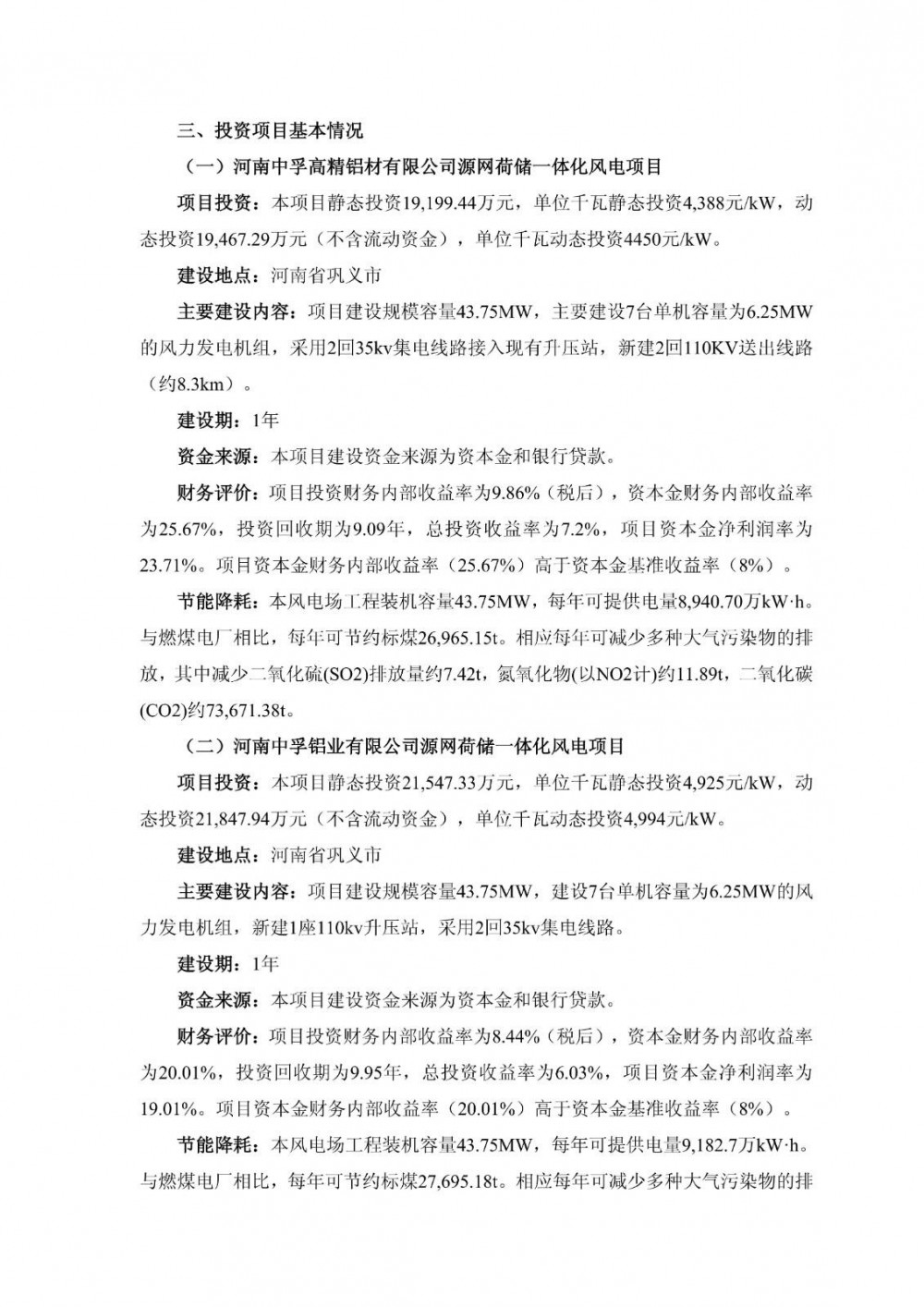 中孚高精铝材源网荷储一体化风电项目和中孚铝业源网荷储一体化风电项目投资金额分别为19,199.44万元和21,547.33万元,合计40,746.77万元。