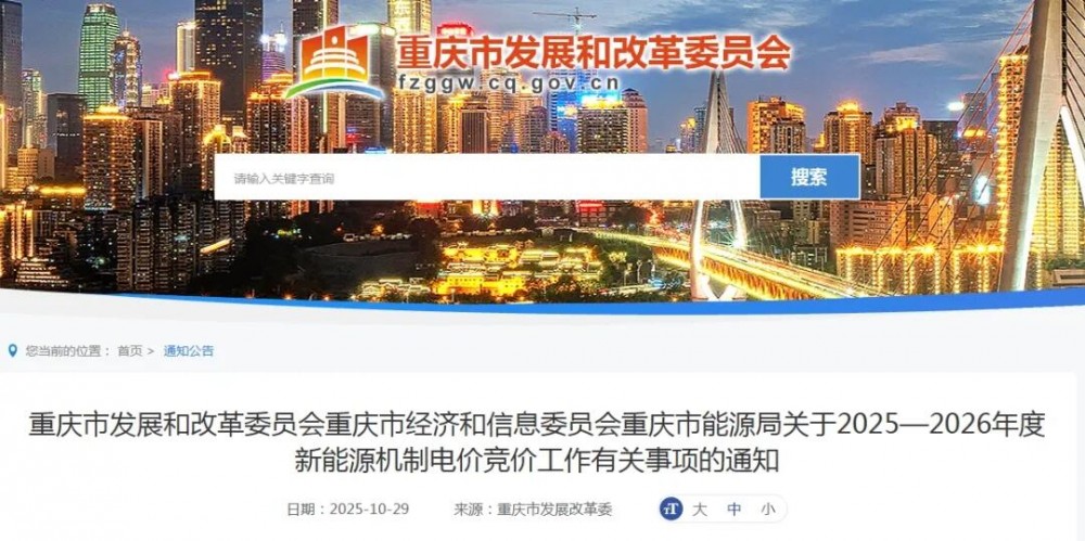 10月29日,重庆市发展和改革委员会、重庆市经济和信息委员会、重庆市能源局发布《关于2025—2026年度新能源机制电价竞价工作有关事项的通知》。